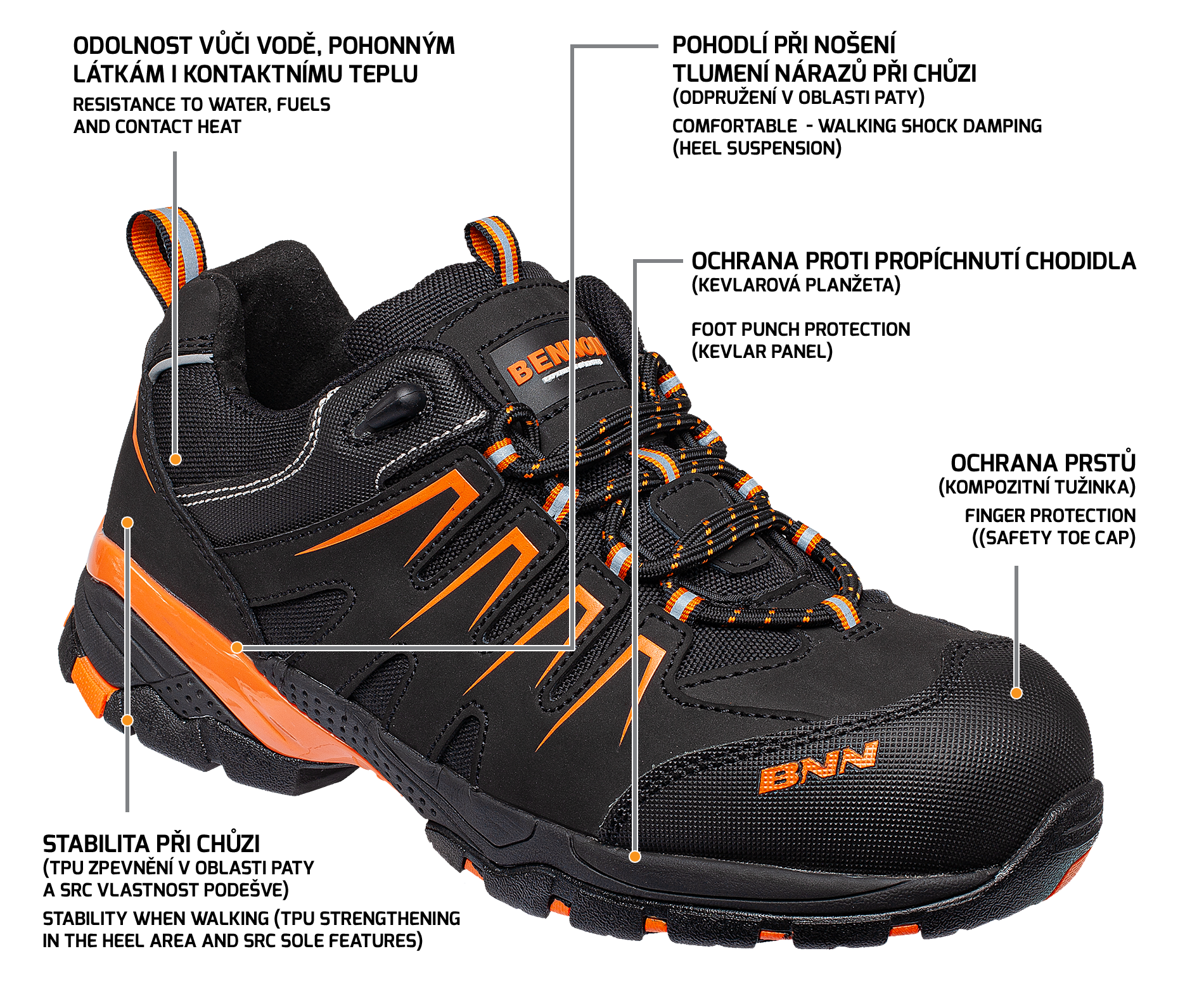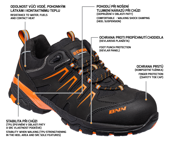 Nemetalická bezpečnostní polobotka v provedení S3, která je odolná vůči vodě, pohonným hmotám i kontaktnímu teplu do teploty 300 °