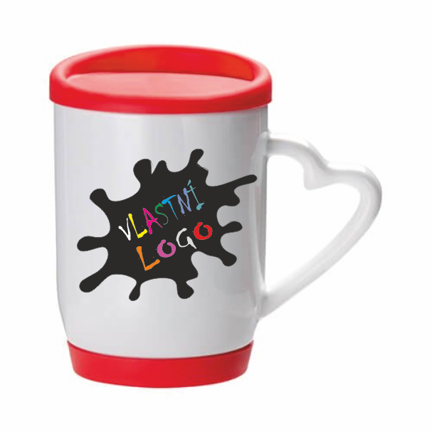 Bílý hrnek s uchem ve tvaru srdce a červeným silikonovým víčkem a podšálkem o objemu 360 ml, potisk vlastním obrázkem nebo fotografií, vhodný dárek k Valentýnu.