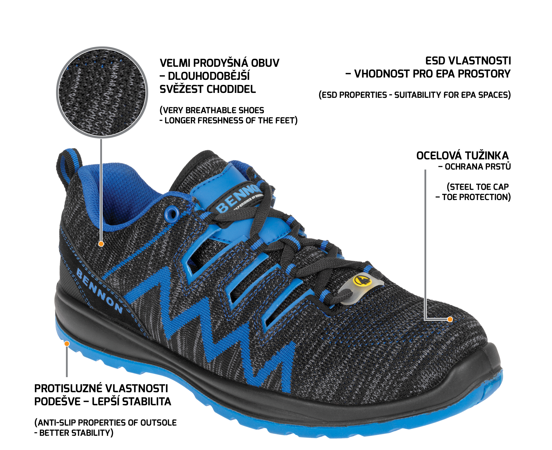 Bezpečnostní sandál kategorie S1 ESD. Svršek tohoto modelu je vyroben z textilní pleteniny, tudíž je obuv velmi prodyšná a chodidla zůstávají déle svěží. Pro ochranu prstů je špice obuvi vybavena ocelovou tužinkou, pocit bezpečí je umocněn podešví Zephyra PU/PU, která splňuje protiskluzné vlastnosti SRC. Díky svým ESD vlastnostem lze obuv doporučit do EPA provozů, dále do vnitřních prostor a suchého venkovního prostředí.Specifikace pro BNN KNITTER S1 ESD SANDAL