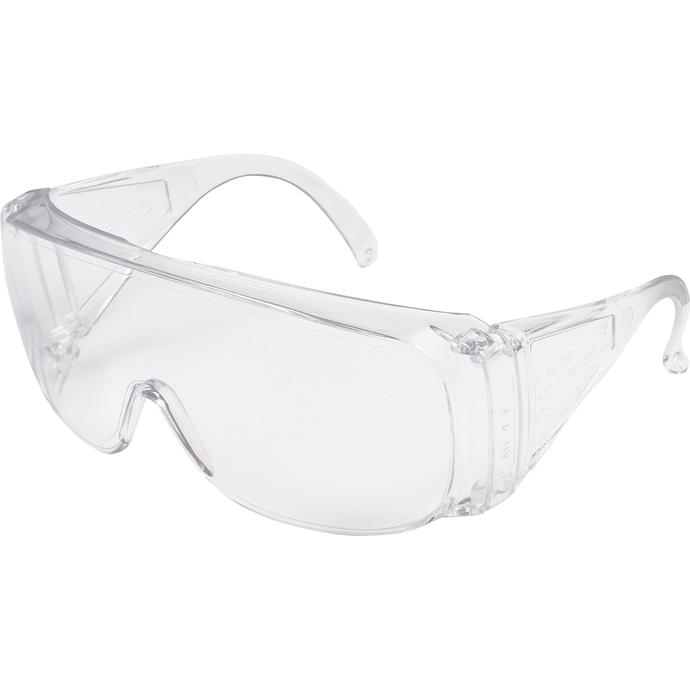 Ochranné brýle s čirým polykarbonátovým zorníkem třídy 1F panoramatického tvaru a možností nasazení na dioptrické brýle.