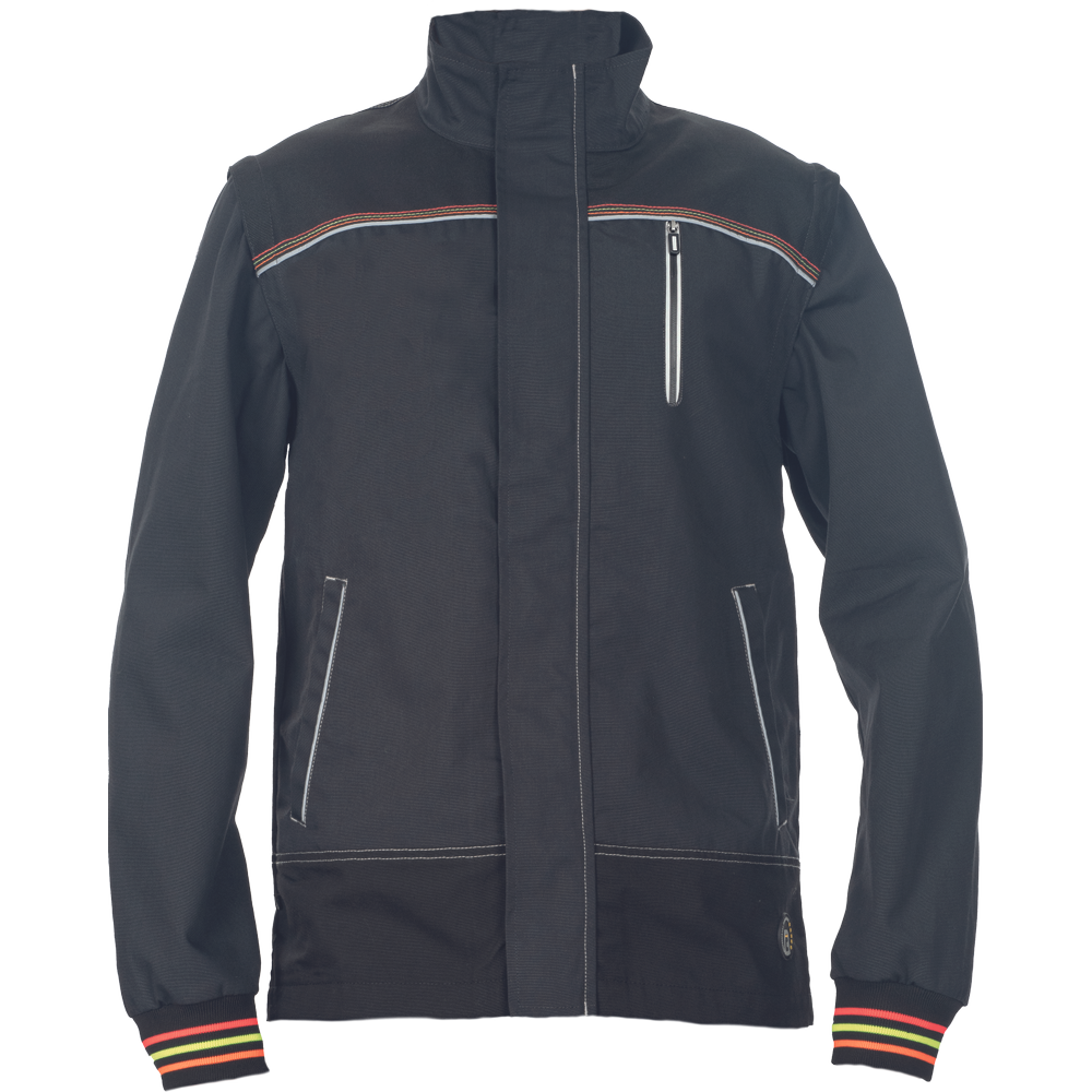 • pánská pracovní bunda moderního střihu se stojáčkem • hluboké postranní kapsy • multifunkční náprsní kapsa • D kroužek pro přichycení identifikační karty • zesílená oblast ramen • náplety na rukávech • prošití kontrastní nití v hi-vis barevném odstínu