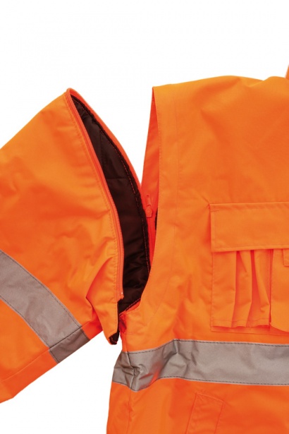 Výstražná, zateplená, 2 v 1, do pasu, odolná proti vodě, odepínací rukávy, kapuce v límci, elastický spodní lem, lepené švy,