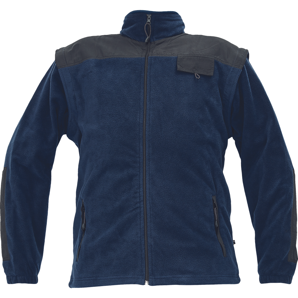 Univerzální pohodlná pracovní fleecová bunda s podšívkou, bez kapuce, celopropínací, náprsní kapsa na suchý zip, dvě velké kapsy na zip, příjemný materiál, v pase na stažení. Zesílená ramena a lokty, odepínatené rukávy. Vhodné použití pracovní bund
