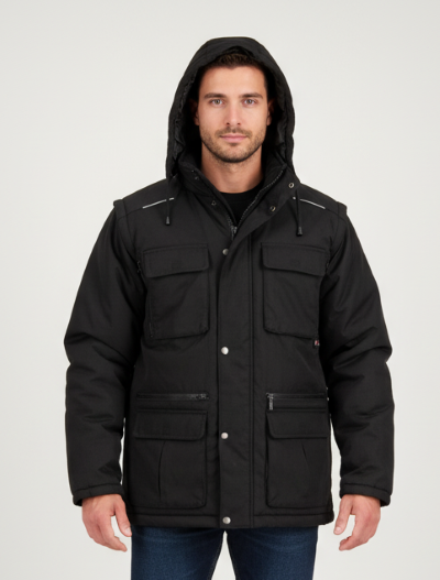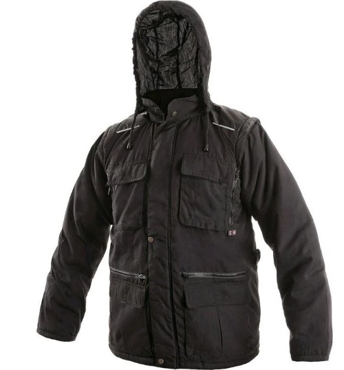 Zateplená, bavlněná, kapuce v límci, zesílená ramena, odepínací rukávy s pružnou manžetou