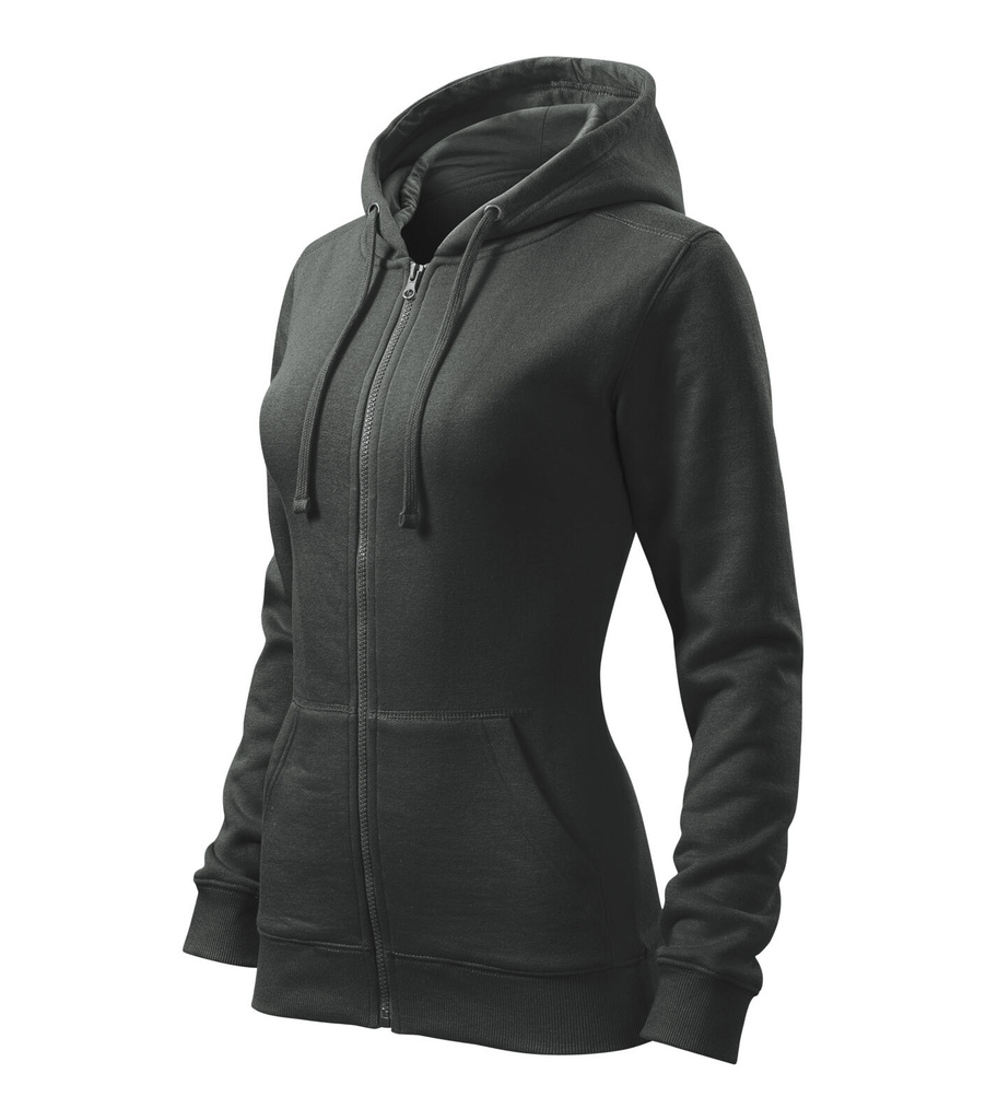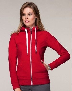Dámská celopropínací mikina s kapucí. Přední kapsa ve stylu klokanky. Sedla a kapsy s dekorativním prošitím.