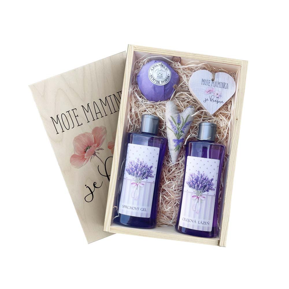 Skvělý dárek pro maminku k narozeninám, k svátku, k Vánocům nebo jako poděkování ke dni matek. Dárek je složený z praktického dřevěného boxu s potištěným zašupovacím víkem, kosmetiky, dřevěného srdce a šumivé bomby.