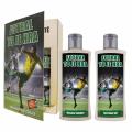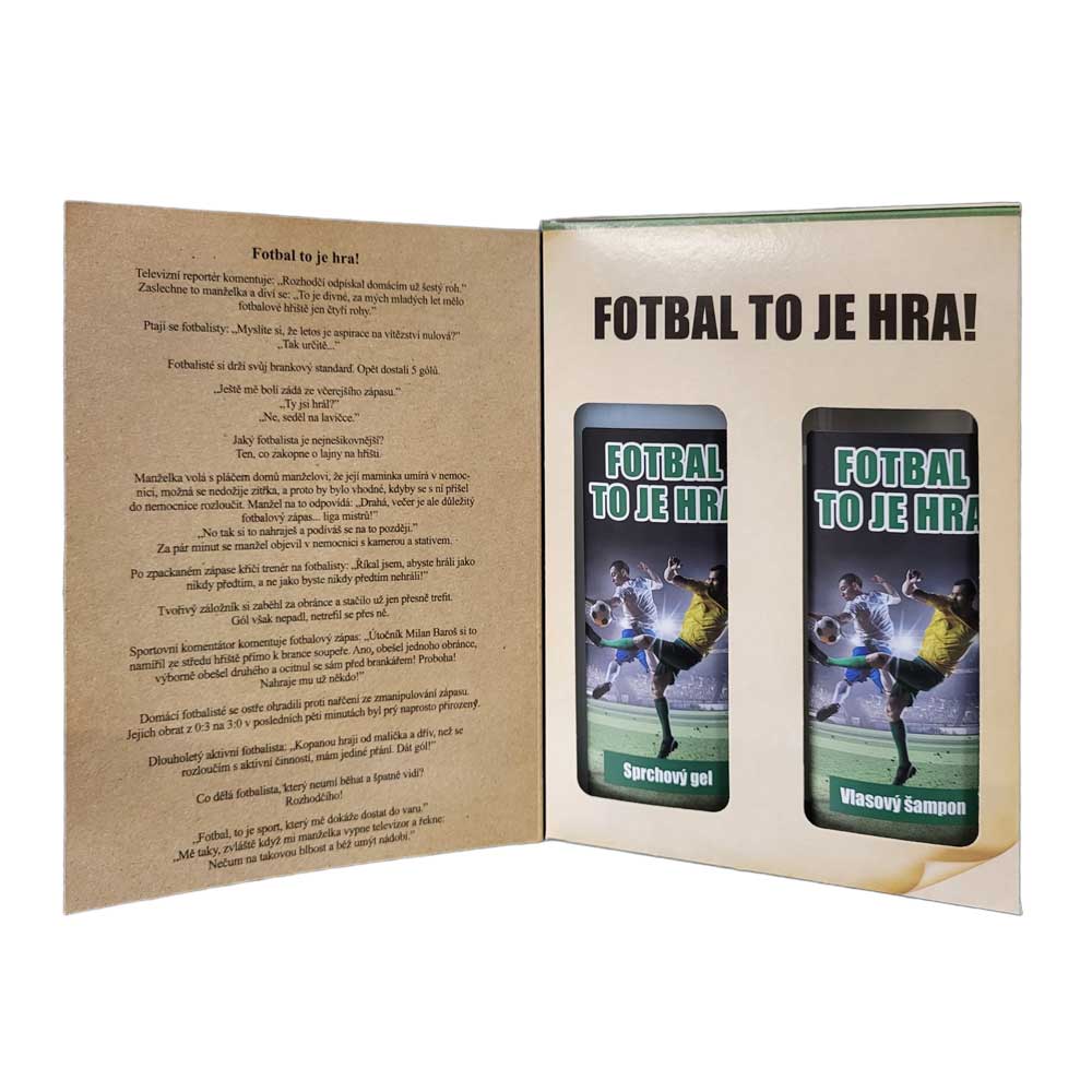Originální dárek pro fotbalistu. Kosmetický dárkový balíček obsahuje sprchový gel a vlasový šampon s olivovým olejem. Po odklopení přední strany krabičky si můžete přečíst několik krátkých fotbalových vtipů.