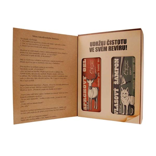 Dárkové balení kosmetiky pro myslivce a milovníky přírody. Kosmetický balíček – sprchový gel 250 ml a vlasový šampon 250 ml s olivovým olejem – v netradičním balení – kniha pro myslivce. Po odklopení přední strany krabičky si můžete přečíst několik krátký