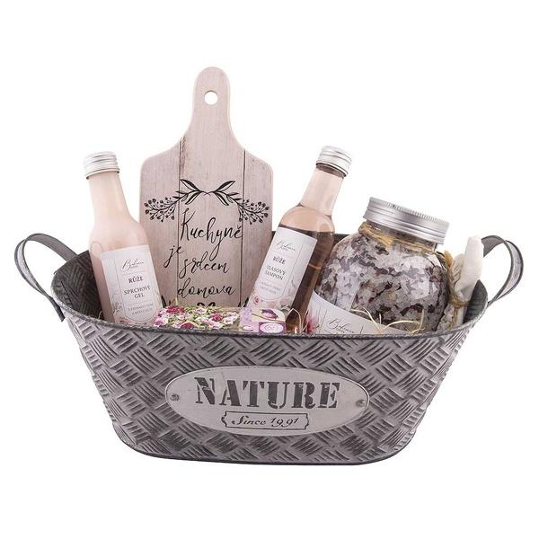 Originální dárkový plechový box obsahuje kosmetické výrobky s extrakty šípku a růže a dekorační prkénko s potiskem. Krásný dárkový koš pro ženu plný voňavých dárků doplněný o praktickou plechovou dózu na květiny.