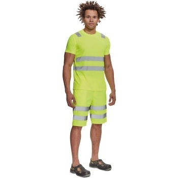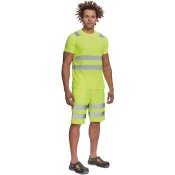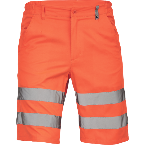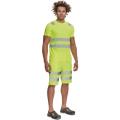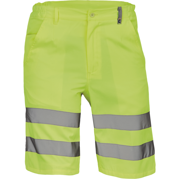 Pánské full Hi-Vis pracovní šortky se 7 cm reflexními pruhy, elastický pas, 2 postranní kapsy + 1 kapsička na drobné, 2 zadní kapsy