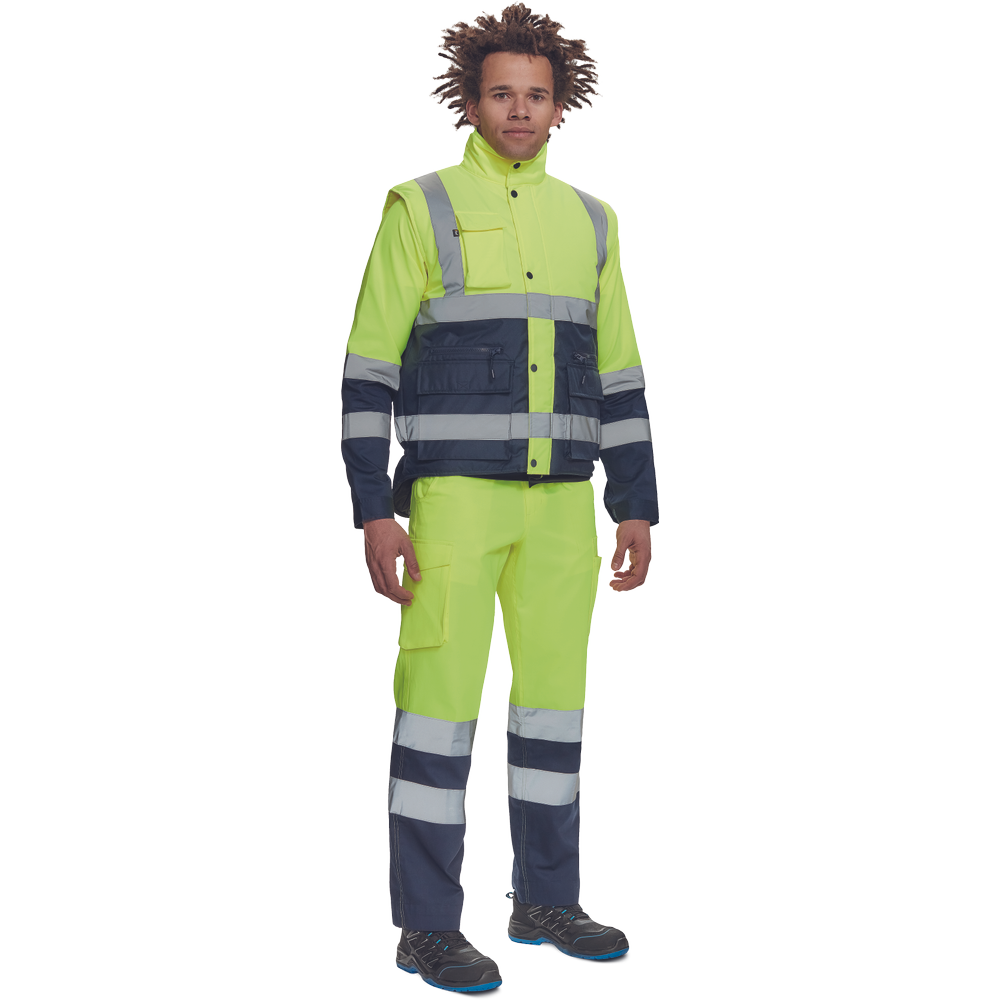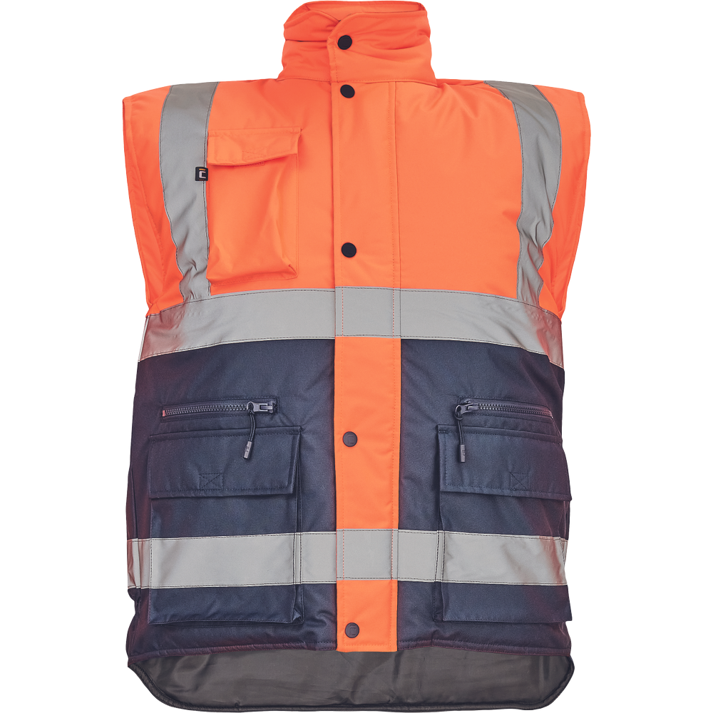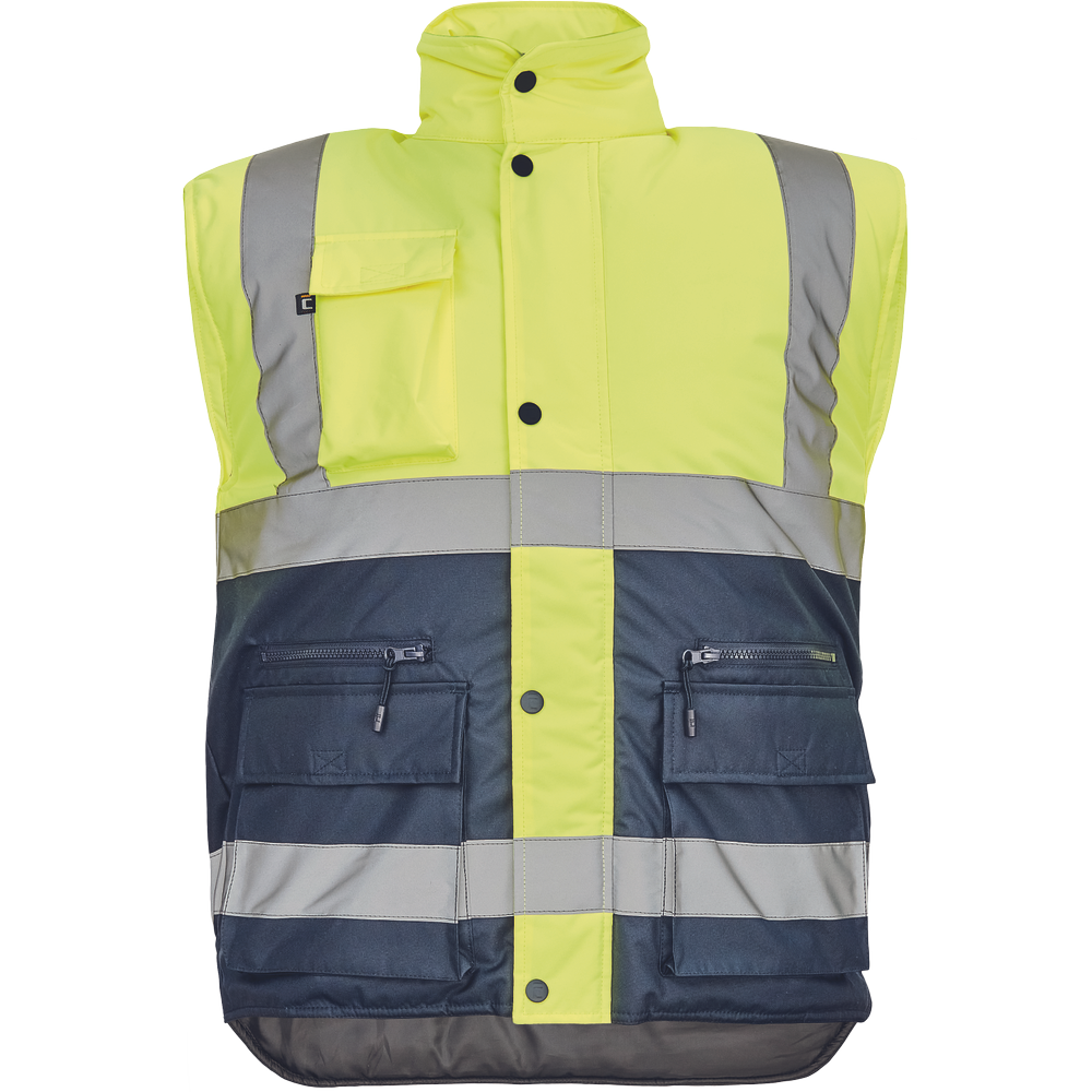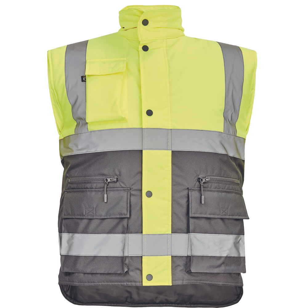 pánská zateplená Hi-Vis vesta s retroreflexními pruhy přes ramena a v bocích, kapuce skrytá v límci, zapínání na zip kryté légou se zapínáním na druky, 2 přední multifunkční kapsy s klopou a zapínáním na zip, 1 nápr