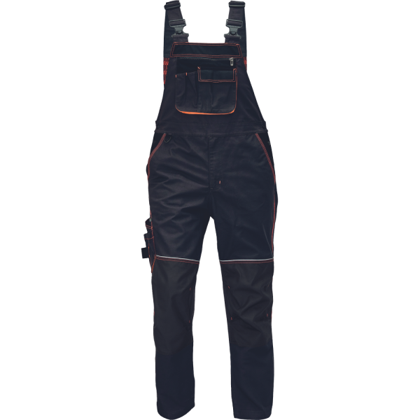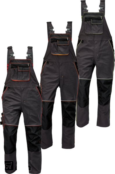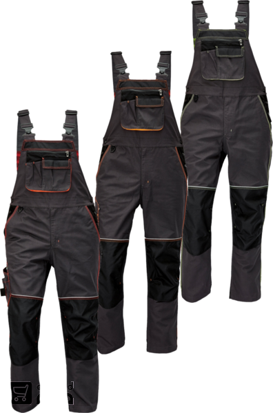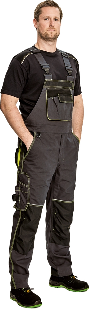 Pánské pracovní kalhoty s laclem. Zesílená oblast kolen s možností vkládání kolenních výztuh. Oblečení je vhodné pro práci ve většině běžných provozů.
