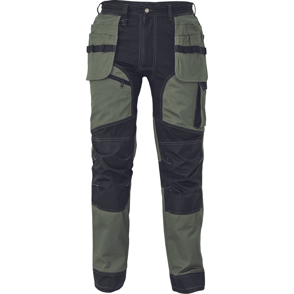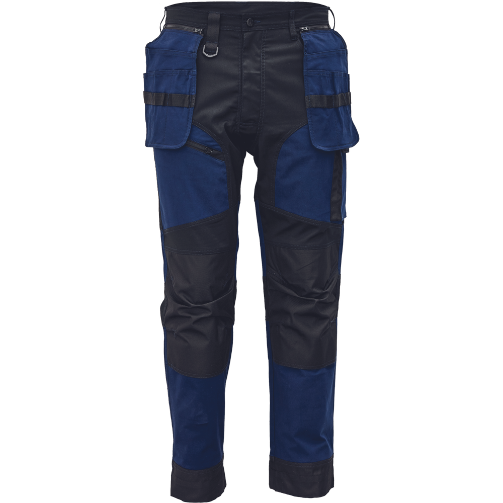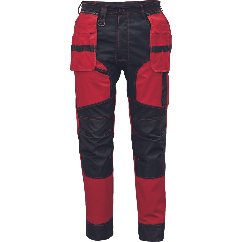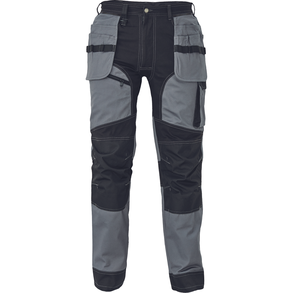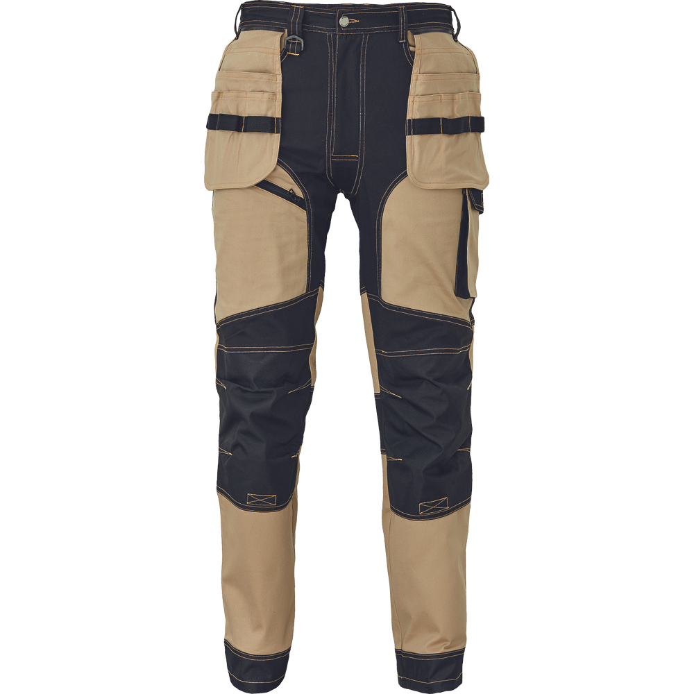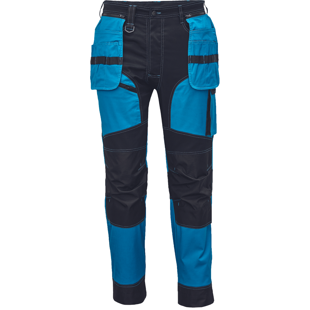 pánské pracovní kalhoty z elastického materiálu; 2 postranní kapsy a 2 vložitelné multifunkční kapsy na nářadí; "D" kroužek; 1 boční kapsa na nohavici s patkou; 1 kapsa na nohavici na zip; 2 nakládané zadní kapsy s patkou; zesílená oblast k