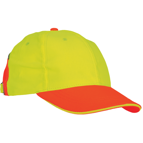 6-ti panelová kšiltovka v kombinaci HI-VIS barev s reflexní paspulkou; nastavení velikosti pomocí kovové spony.