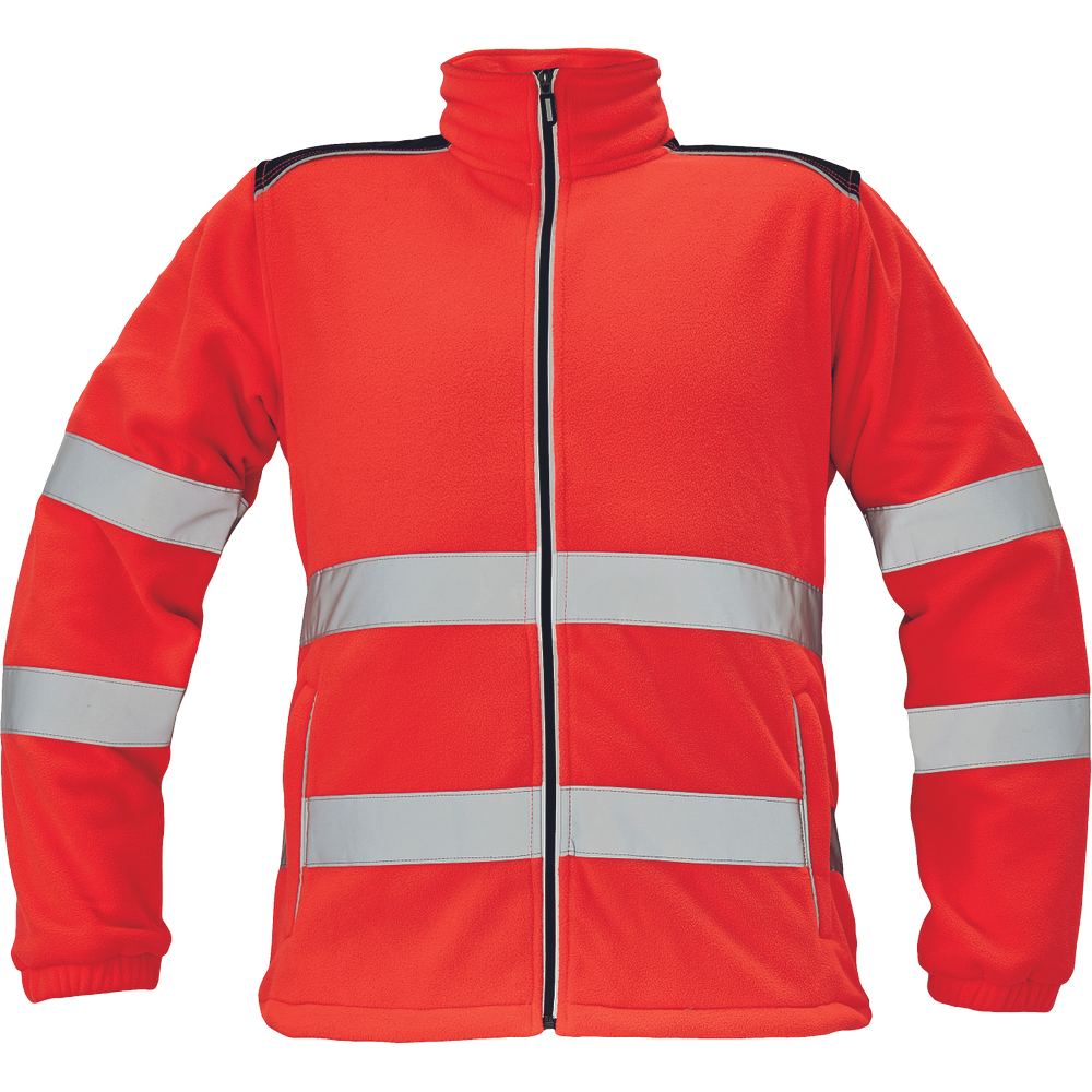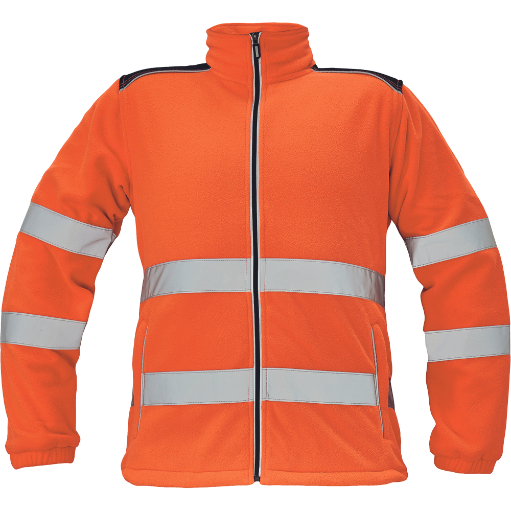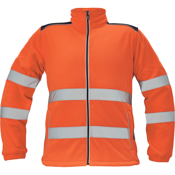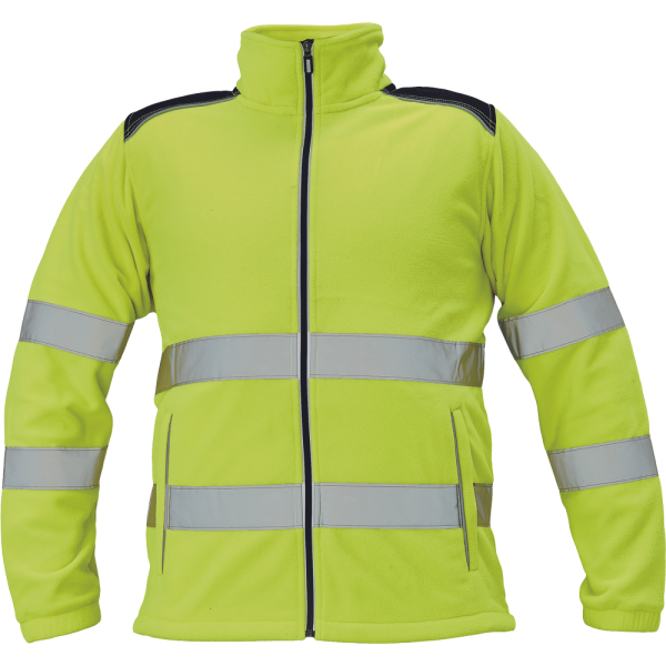 Fleecová celopropínací HI-VIS bunda se stojáčkem z materiálu s antipilling úpravou; zesílená oblast ramen a loktů; reflexní paspulka lemující sedlo a lištové kapsy; stahovací šňůrka s brzdičkou na nastavení šíře spodního obvodu; dekorativní prošití v kontrastní barvě.