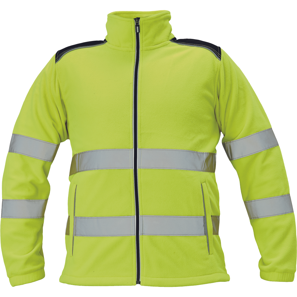Fleecová celopropínací HI-VIS bunda se stojáčkem z materiálu s antipilling úpravou, zesílená oblast ramen a loktů a reflexní paspulka lemující sedlo a lištové kapsy.