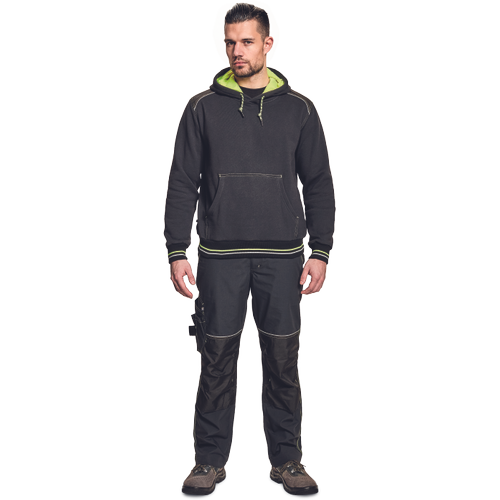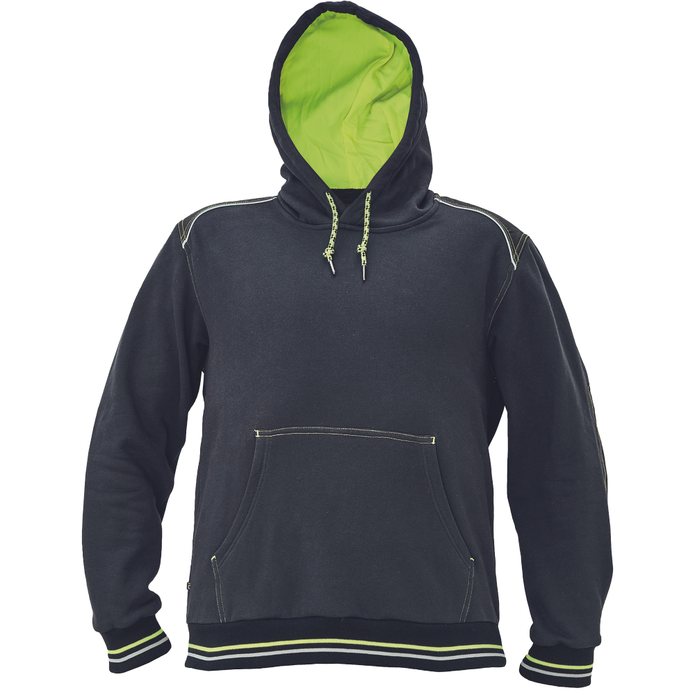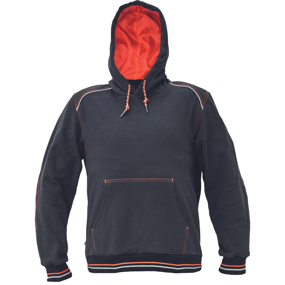 Mikina s kapucí a klokaní kapsou ze směsového počesaného úpletu bavlny a polyesteru; zesílená oblast ramen a loktů; reflexní paspulka lemující sedlo a lištové kapsy; dvojitá kapuce; dekorativní prošití; pružné náplety na rukávech a spodním obvodu.