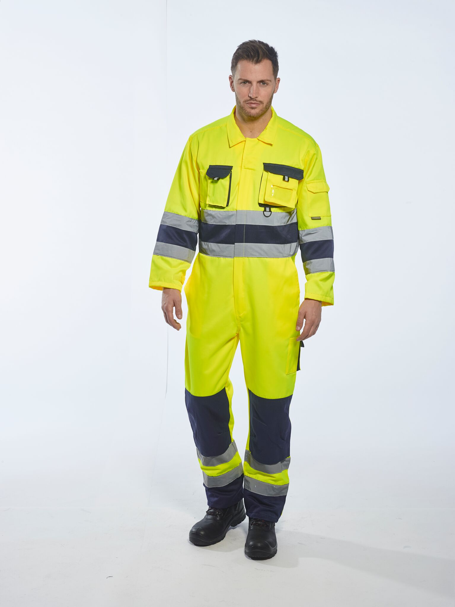 Kombinéza Nantes Hi-Vis - tato stylová kombinéza nabízí kompletní certifikovanou ochranu pro každého, kdo pracuje v blízkosti dálnic nebo silnic. K užitečným funkcím patří kapsy na kolenní vložky a zadní elastická část pro volnějš