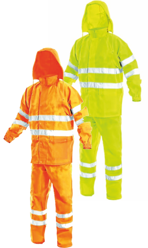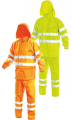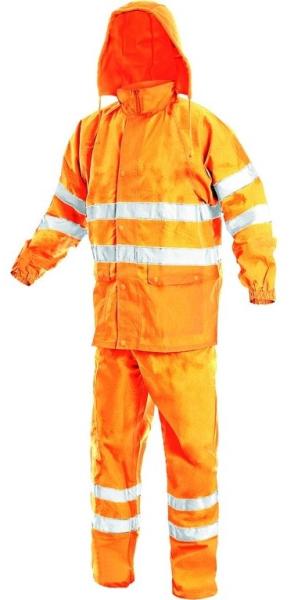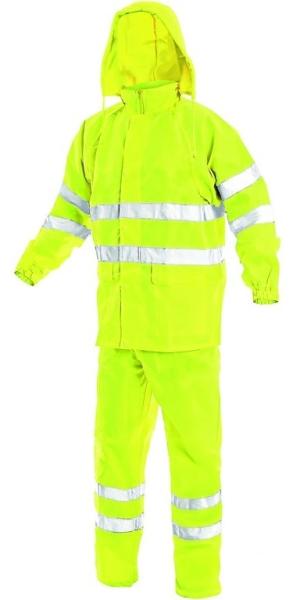 Výstražný, nepromokavý, lepené švy, bunda s odepínací kapucí, kalhoty v pase do gumy