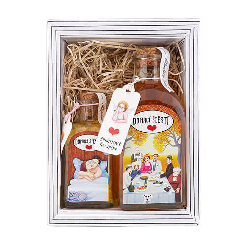 Kosmetický balíček Domácí štěstí obsahuje sprchový gel a sůl do koupele. Arganový sprchový šampon a koupelová sůl jsou ve skleněném obalu s krásnou romantickou etiketou a šetrně myjí pokožku celého těla.