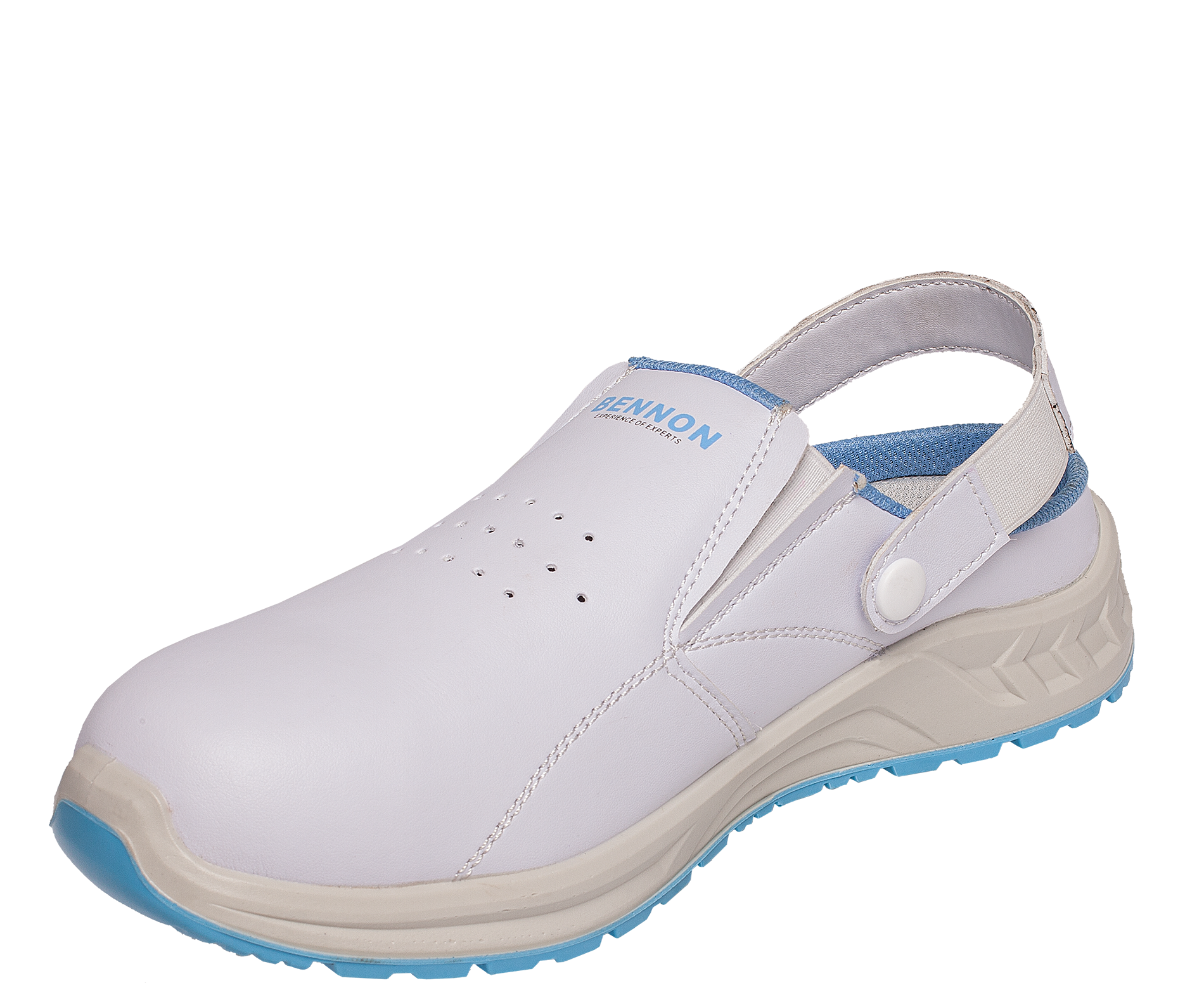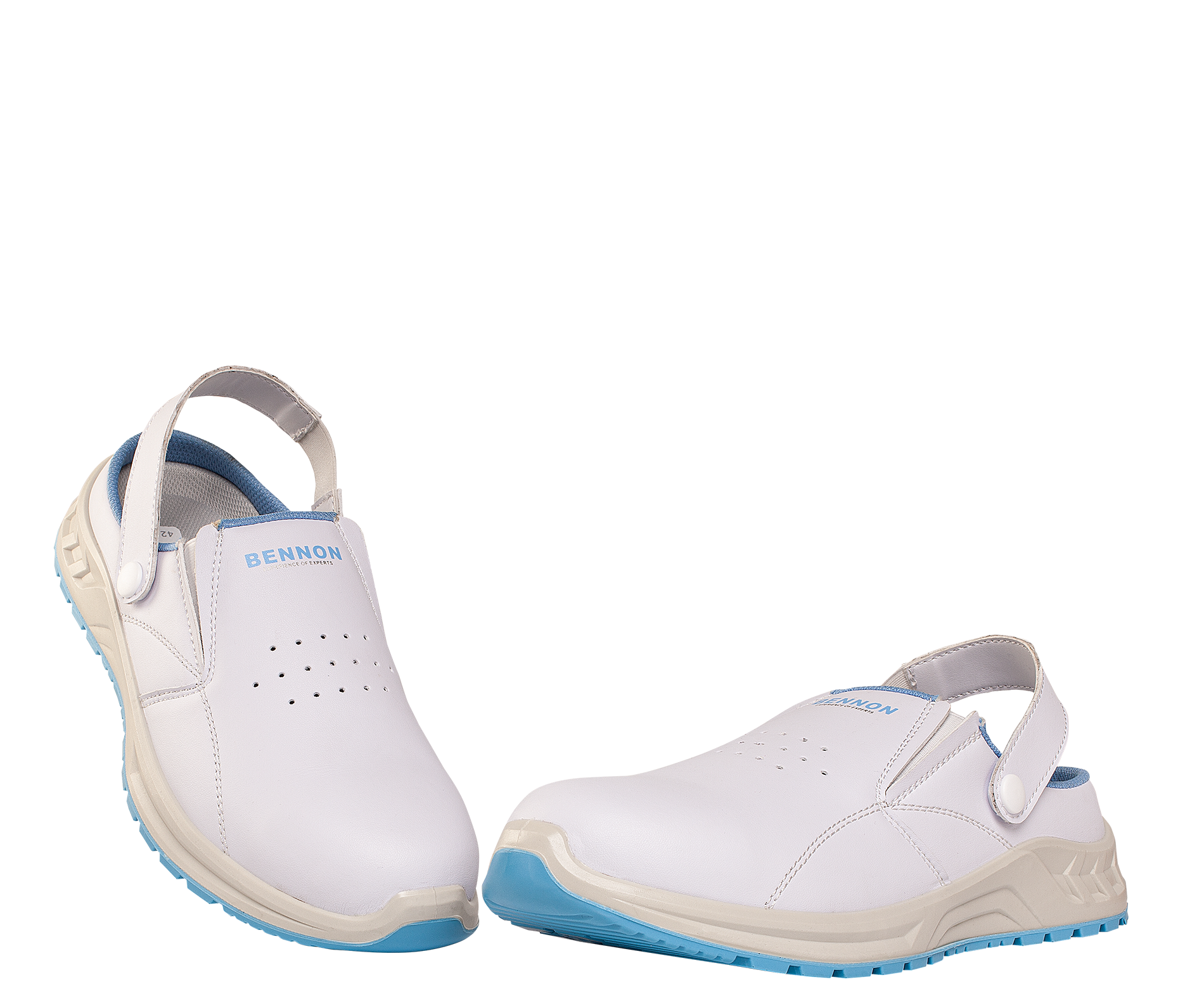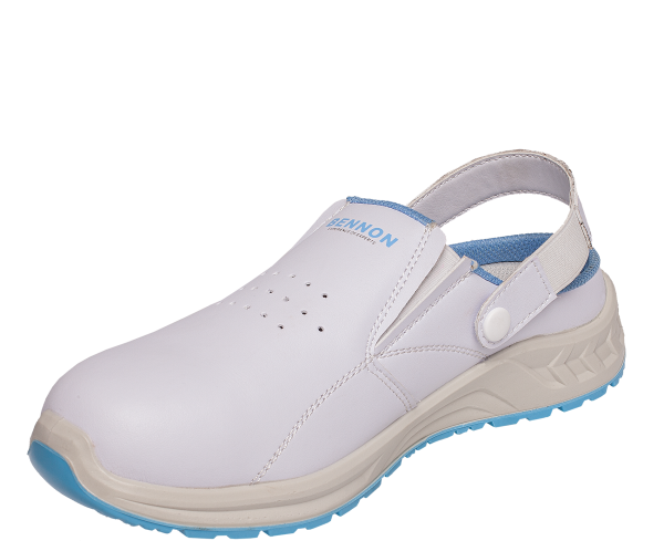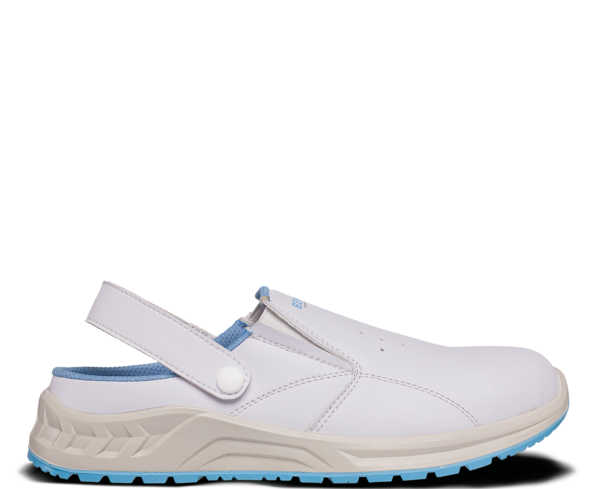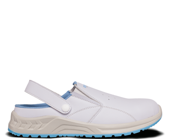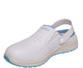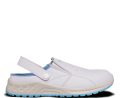 Vzdušná specializovaná bílá obuv sandálového střihu s odepínatelným patním páskem.Bílá, dobře omyvatelná, antistatická obuv.