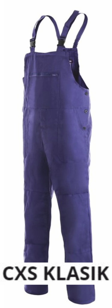 Pánské kalhoty s náprsenkou, zdvojená kolena, náprsní kapsa na zip, boční kapsa na metr, pas v zádní části do gumy.
