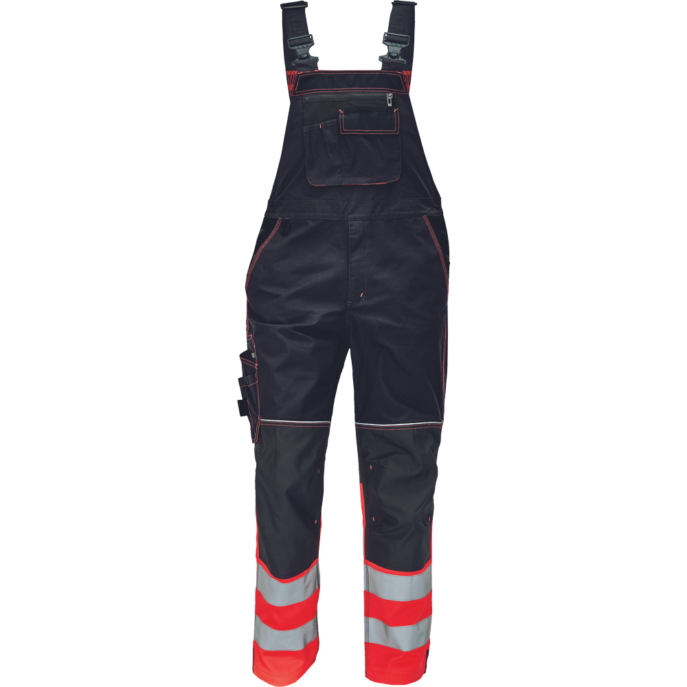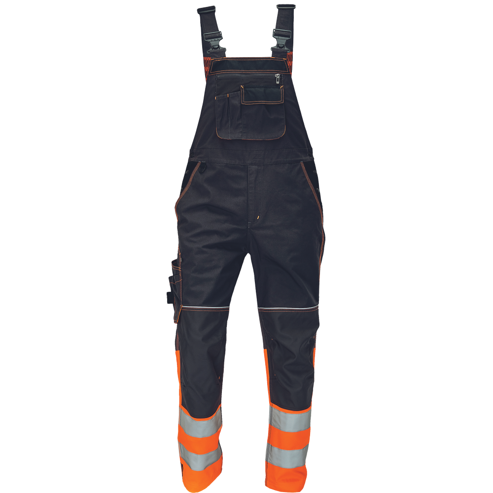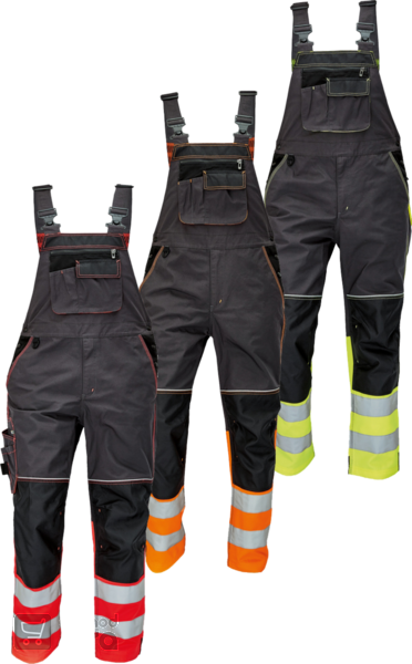 Pánské pracovní kalhoty s laclem v kombinaci s hi- vis materiálem ve spodní části nohavic a 2 našitými reflexními pruhy. Oblečení je vhodné pro práci ve většině běžných provozů.