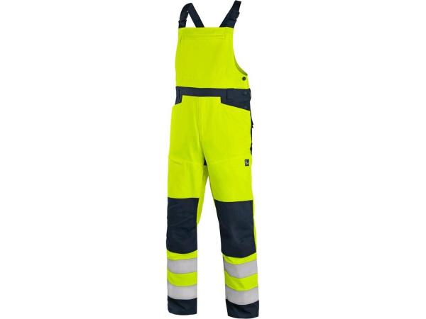Pánské výstražné kalhoty s náprsenkou, letní, šle s gumou vzadu, náprsní kapsa na zip, boční zapínání na knoflíky, kryté přední zapínání na zip, 2 přední kapsy, 2 zadní kapsy s klopou na suchý zip, pravá boční kapsa na zip, zdvojená kolena s možností vložení kolenních výztuh.