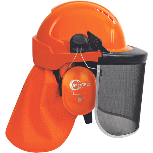 Lesnický komplet skládající se z: oranžové helmy EVOLite s posuvnou sponou, držáku štítu, drátěného štítu a integrovaných sluchátek InterGP (SNR: 25) a výstražné plachetky na zátylku. Splňuje EN397, EN50365, EN 352-3 a EN1731.