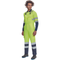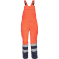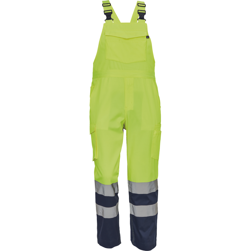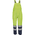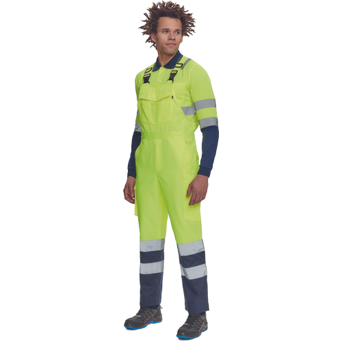 Pánské lehké HI-VIS pracovní kalhoty s laclem a reflexními pruhy na nohavicích, elastický pas; 2 boční kapsy, 1 kapsička na mince; 2 multifunkční stehenní kapsy, 2 zadní kapsy; 1 velká multifunkční náprsní kapsa.