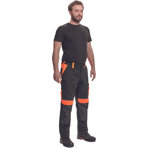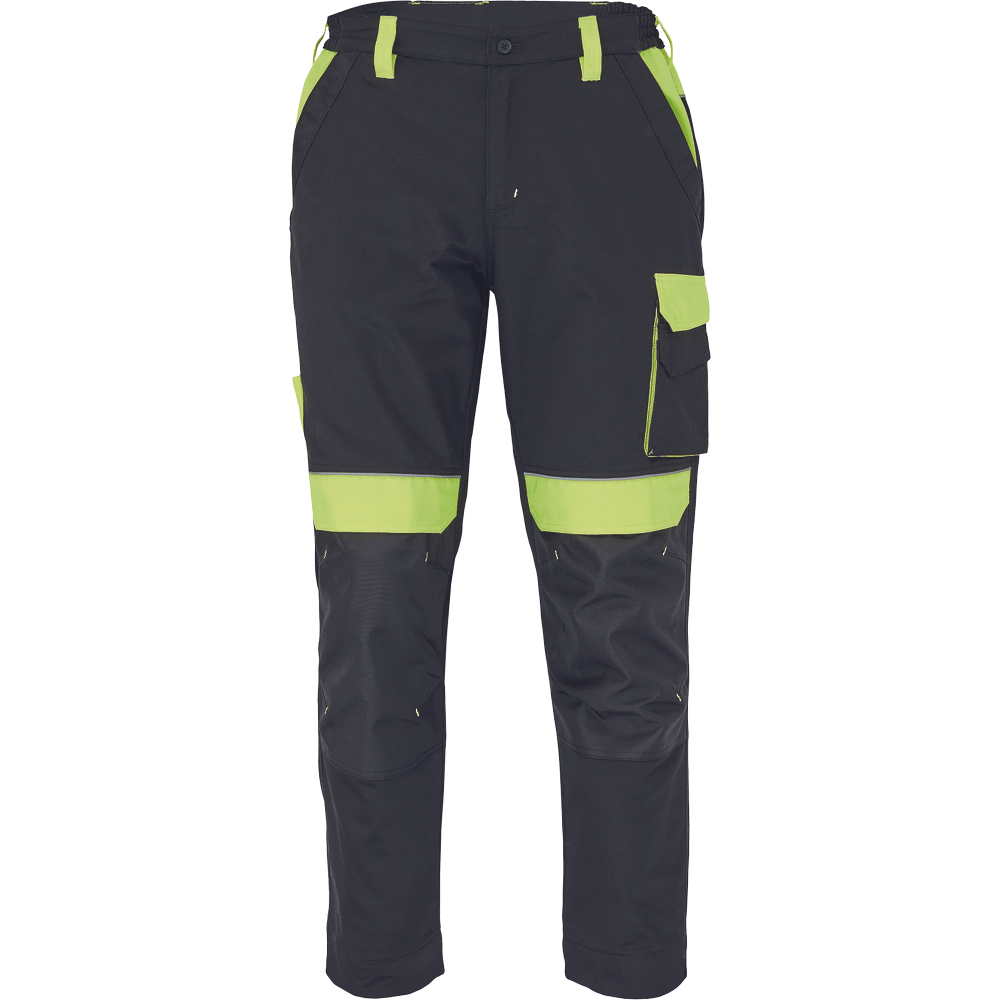 Pánské pracovní kalhoty s elastickým pasem; 2 přední kapsy, 1 levá zdvojená stehenní kapsa; 2 zadní kapsy, 2 menší zadní kapsičky na pravém stehnu; reflexní paspulky; Oxford 600D zesílení kolen s možností horního vkládání nák