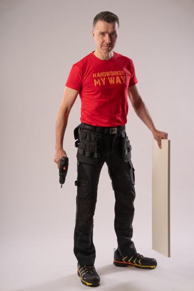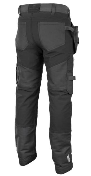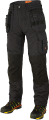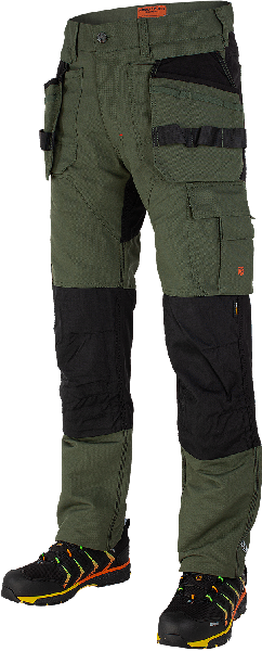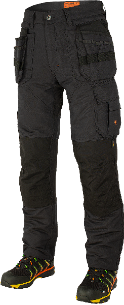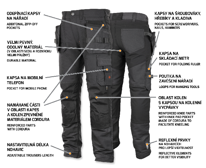 Velmi pevný, odolný materiál, v oblasti sedu a rozkroku velmi pružný namáhané části v oblasti kapes a kolen zpevněné materiálem Cordura 500D vyznačují se vysokou pevností a odolností vůči otěru a jiným mechanickým poškozením vodoodpudivý zátěr. Reflexní prvky na nohavicích pro lepší viditelnost, odepínací kapsy na nářadí, kapsy na šroubováky, hřebíky a kladiva poutka na zavěšení nářadí, kapsa na skládací metr a na mobilní telefon, oblast kolen s kapsou na kolenní vycpávky. Nastavitelná délka nohavic, štítek na jmenovku, tento výrobek splňuje normu EN ISO 13688:2013/A1:2021.