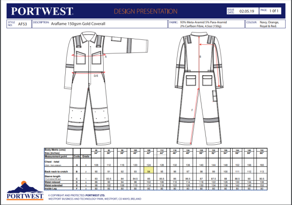 Specifikace pro Nehořlavá kombinéza Araflame Gold