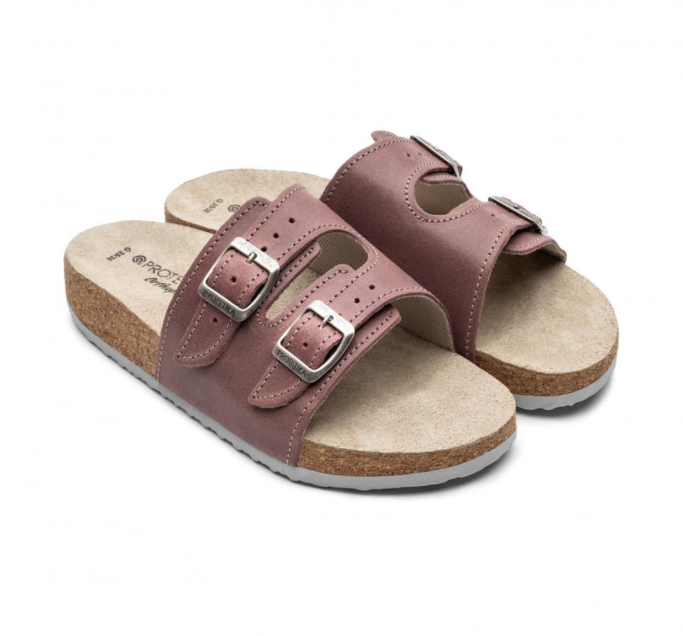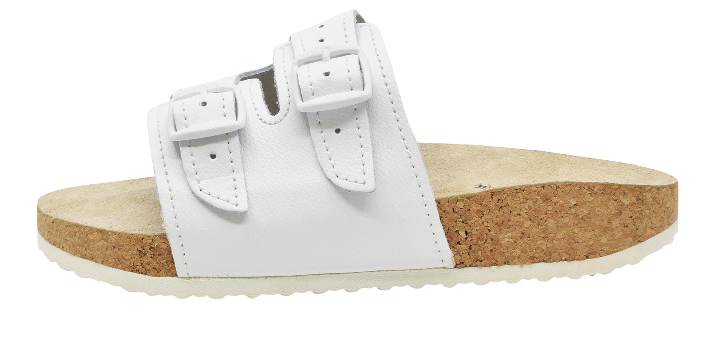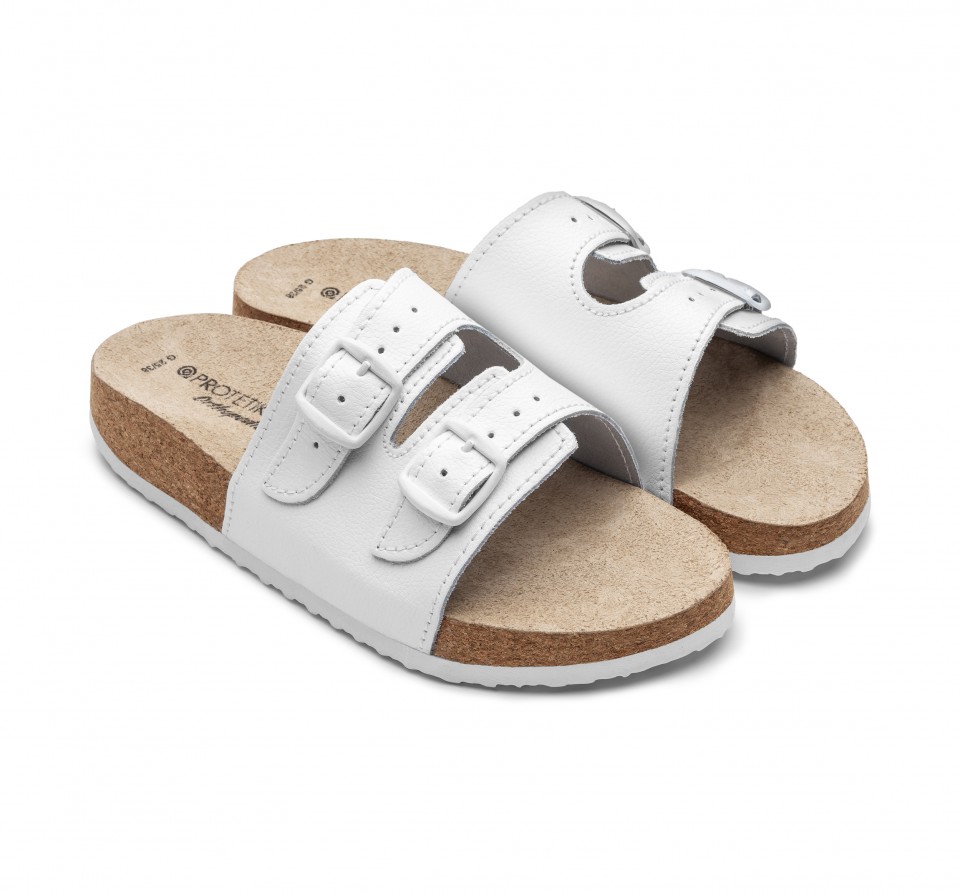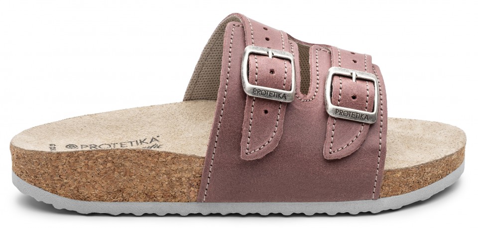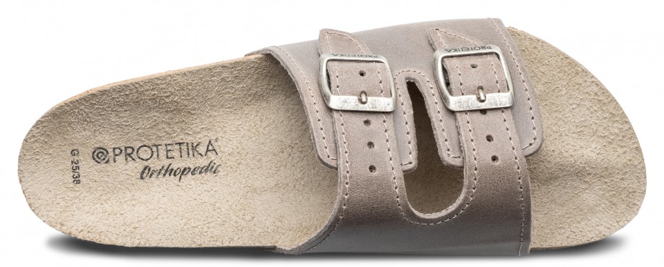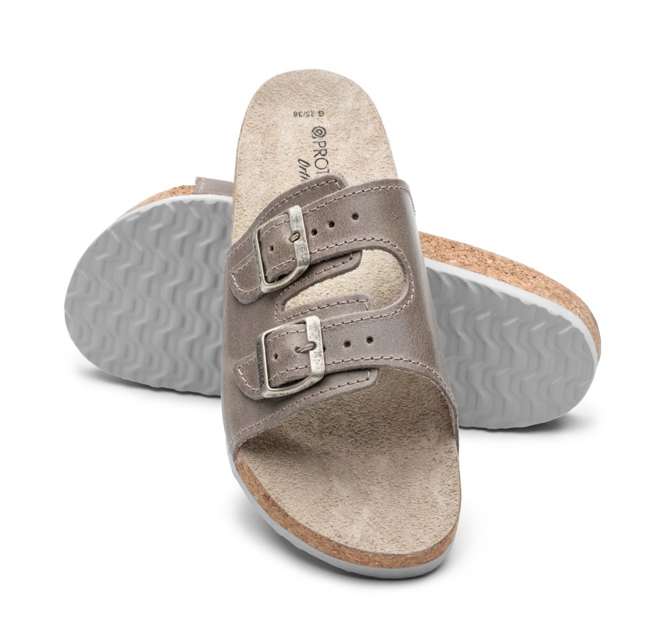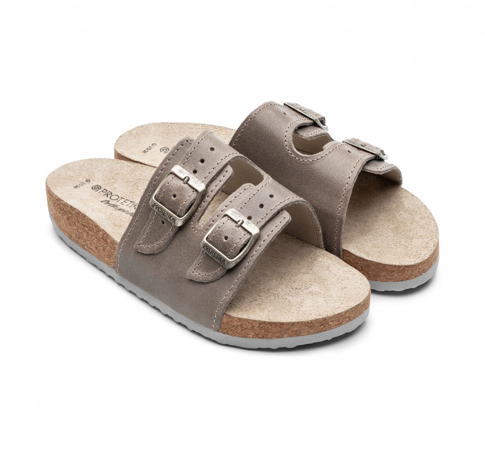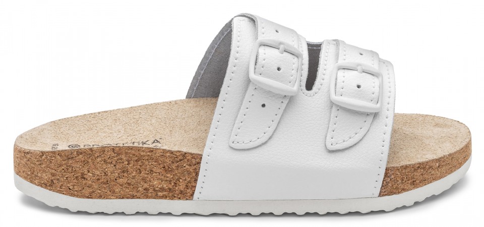 Sandály mají dvoupřezkové zapínání, které umožňuje rychlé a pohodlné přizpůsobení dle potřeby. Svršek je vyroben z kvalitní přírodní kůže a anatomicky tvarovaný výlisek je z přírodního korku. Stélka s širokou prstovou částí a patním lůžkem zajišťuje přirozené rozložení váhy těla a stabilitu chodidla při chůzi. Podpora příčné a podélné klenby chodidla aktivně přispívá k prevenci plochonoží.