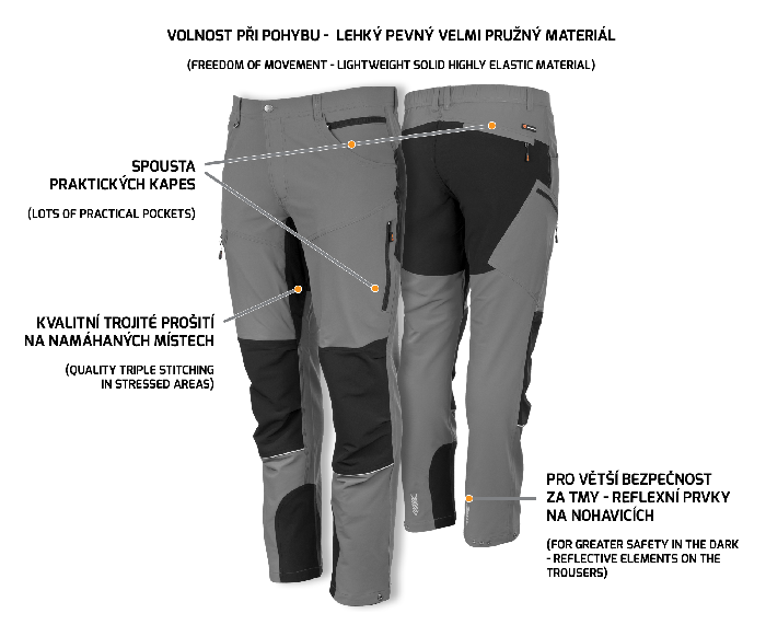 - kvalitní trojité prošití na namáhaných místech: v oblasti rozkroku a na vnitřní straně nohavic