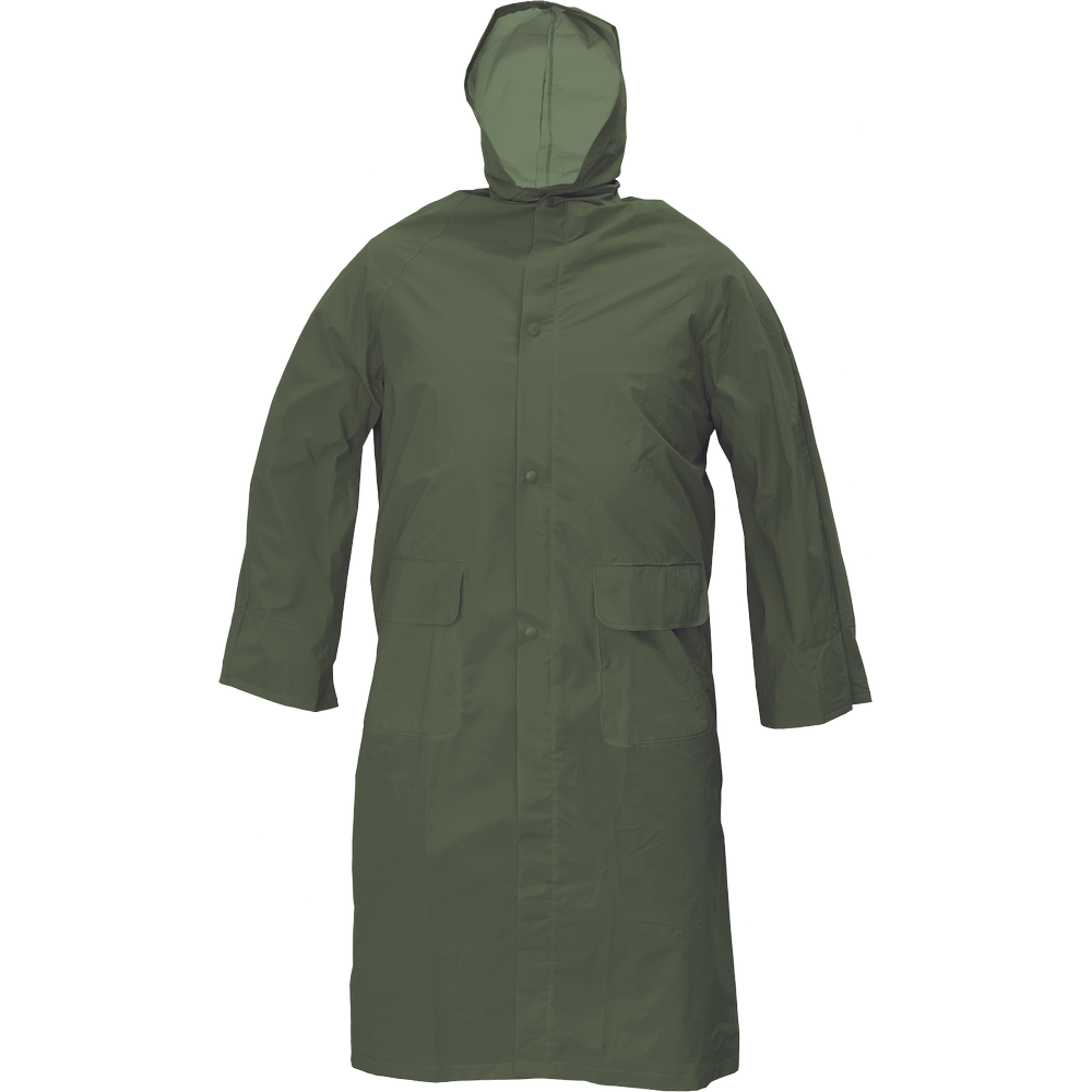 Pracovní nepromokavý plášť s kapucí, PVC-polyester, zelený. Ochrana před ušpiněním, vodou a ochrana proti klimatickým vlivům. Využití ve volném čase, průmyslu, vhodný jako nepromokavý plášť pro rybáře, do lesa.Specifikace pro Plášť s kapucí CETUS zelený