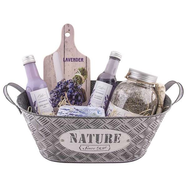 Originální dárkový koš s levandulovou kosmetikou je skvělý dárek pro ženu k narozeninám, svátku nebo k Vánocům. Kvalitní česká kosmetika s vůní levandule a bylinným extraktem a praktický plechový box pro dekoraci v domácnosti, použitelný i jako květník nebo miska na květináče