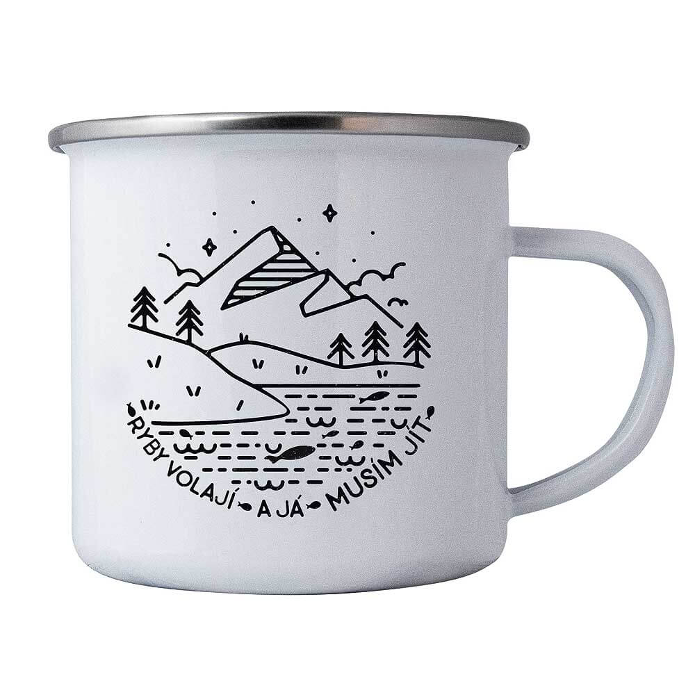 3. Plechový smaltový hrnek 350 ml v krabičce – pro rybáře – ryby volají