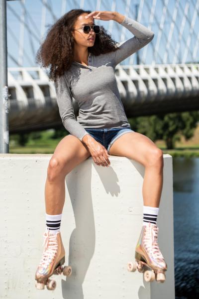 Tričko má lehce vypasovaný střih s bočními švy, který zdůrazňuje ženské křivky a zaručuje pohodlné nošení. Límeček je zdoben dvojitým reliéfním proužkem z žebrového úpletu 1:1, který dodává tričku moderní vzhled.