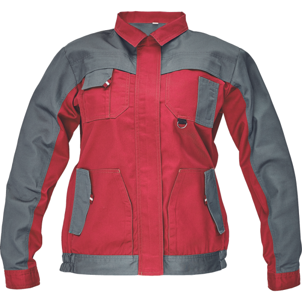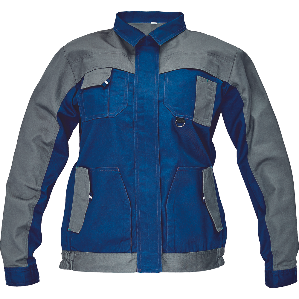 Dámská pracovní bunda se zapínáním na zip krytým légou a pružným pasem; 2 přední kapsy s klopou; 2 multifunkční náprsní kapsy.