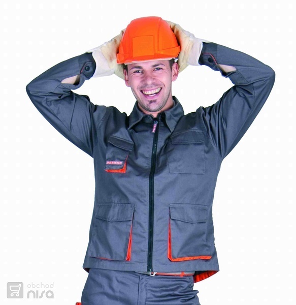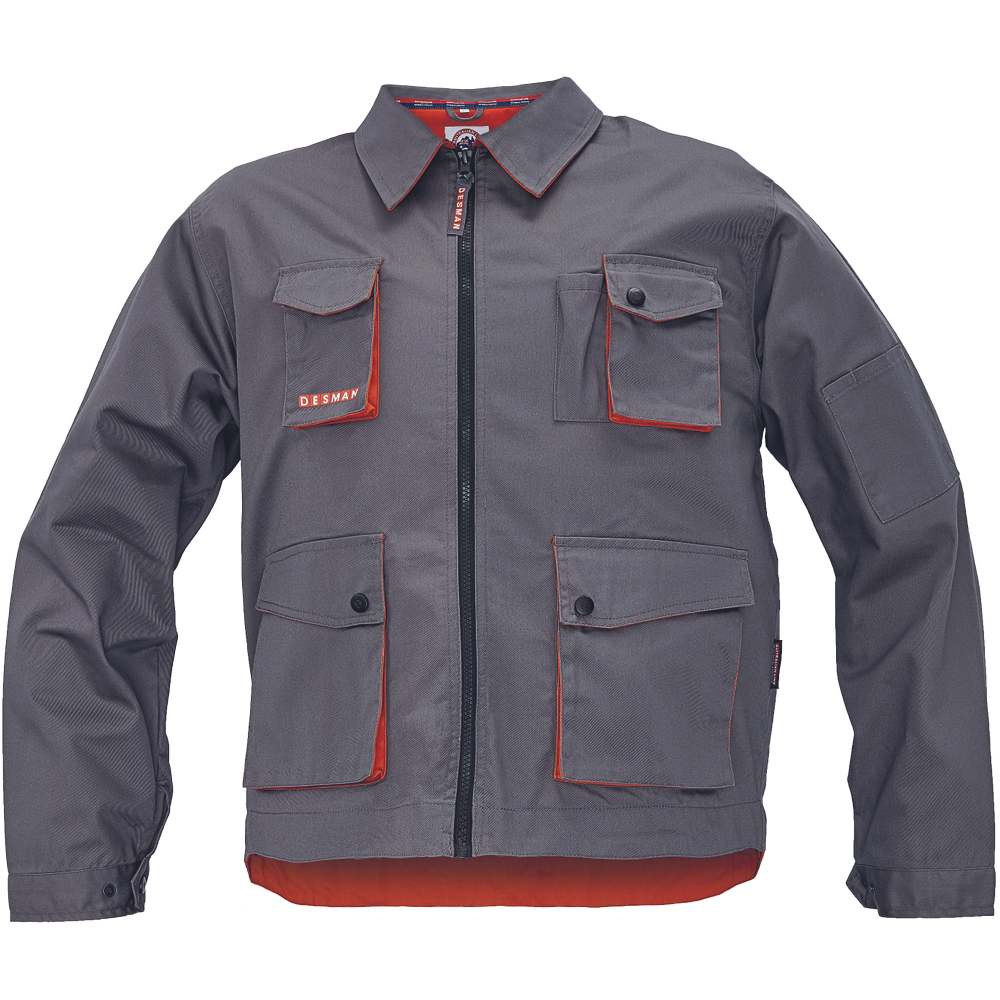 Montérková bunda Desnen má oranžové doplňky, 4 vnější a 4 vnitřní kapsy jsou u této pracovní bundy nedílnou součástí.