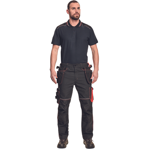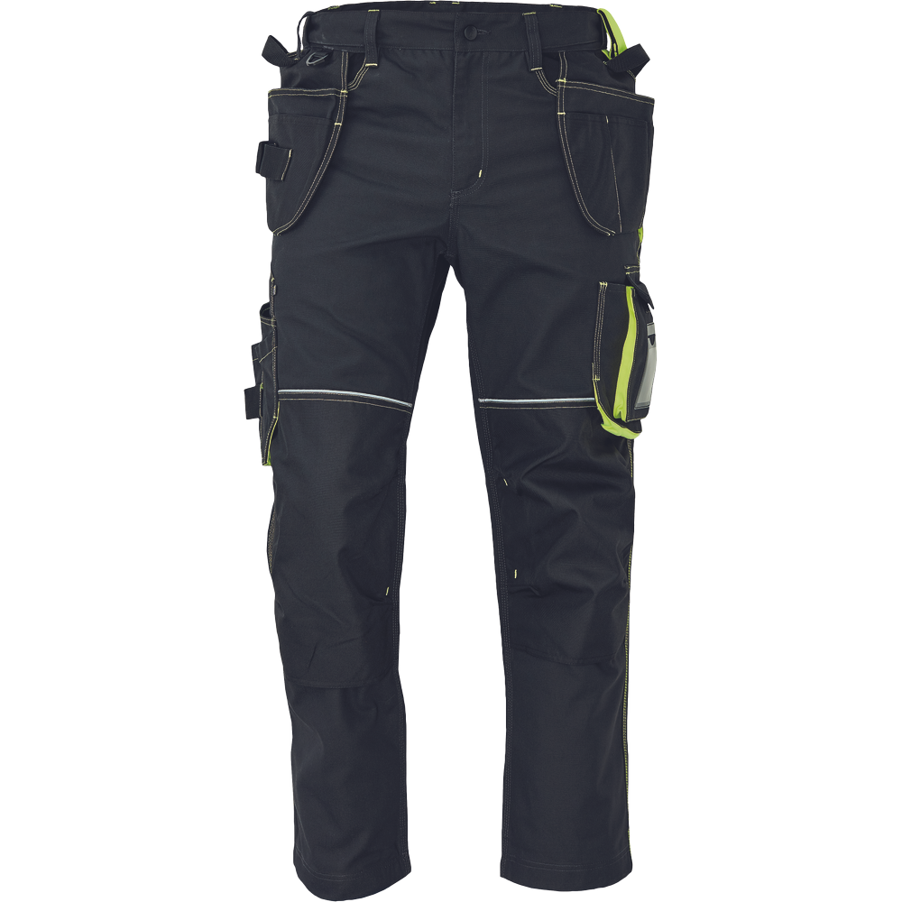 Kvalitní pánské pracovní klahoty s elastickým pasem; 6 multifunkční kapes na nářadí; 2 extra vložitelné kapsy; 1 transparentní pro ID kartu; 600D Oxford zesílená oblast kolen s možností vkládání kolenních výztuh; záložka na nohavici umožňující prodloužení délky až o 5 cm; dekorativní prošití a kontrastní prvky v HI-VIS barvě.