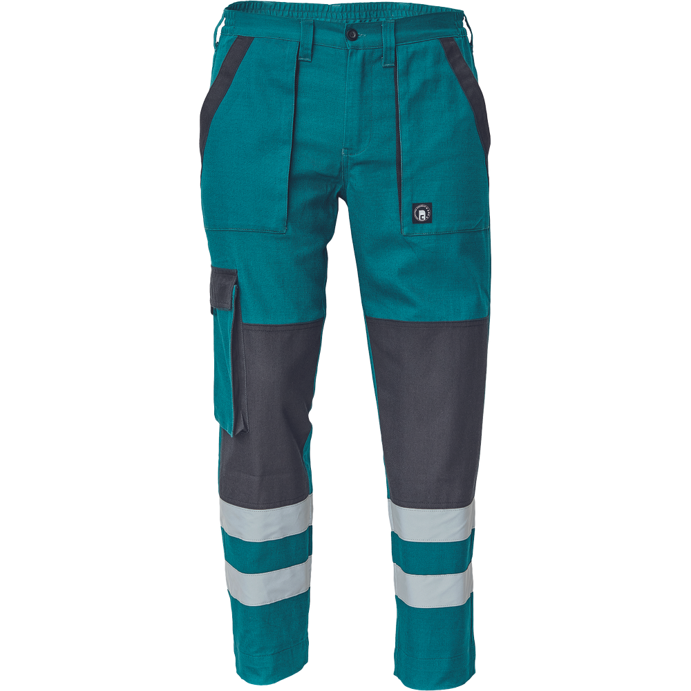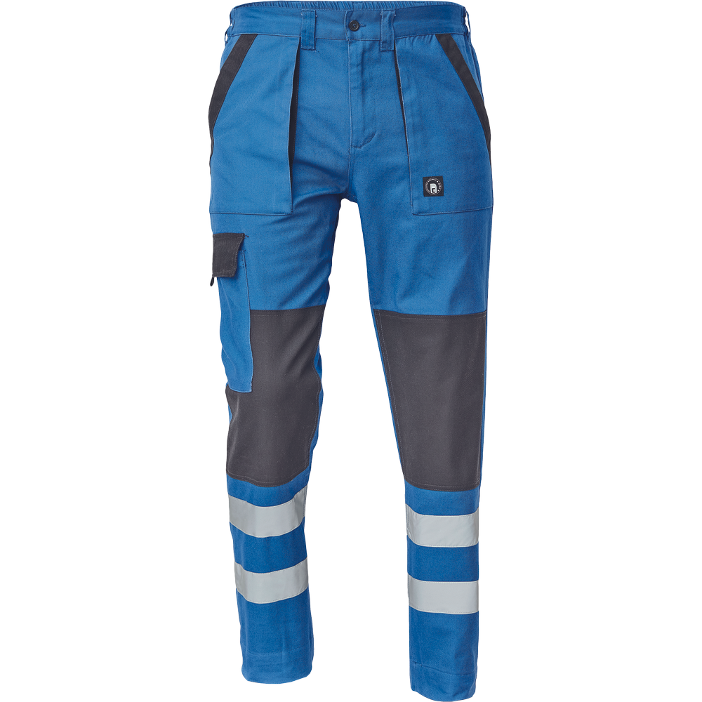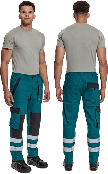 Pánské pracovní kalhoty s elastickým pasem a reflexními pruhy na spodní části nohavic. Dvojité zahnutí spodního lemu pro prodloužení až o cca 4,5 cm.