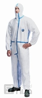 Jednorázový ochranný oblek s kapucí a přelepenými švy, antistatický, bez silikonů, kat. III, typ 4B, 5B a 6B. Ochrana proti vodě, roztokům chemikálií, azbestu a prachu. Materiál: 100% polypropylén TYVEK, netkaná textilie