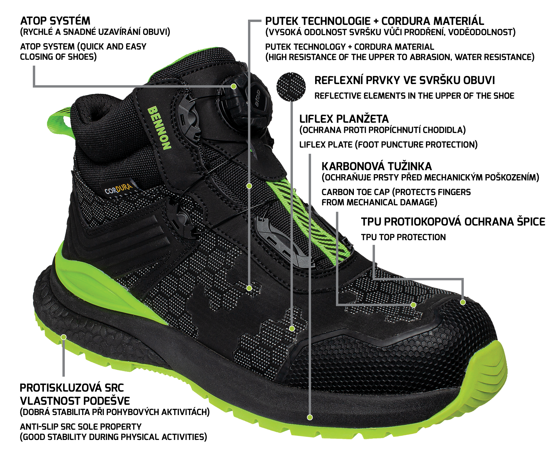 Tato obuv představuje revoluci v pracovní obuvi, neboť v sobě skloubila spoustu užitečných vlastností v jednom. Vyznačuje se vysokou odolností vůči mechanickému poškození, vůči vodě, kontaktnímu teplu, uzavírání obuvi je snadné a rychlé, obuv má spoustu bezpečnostních prvků, anatomicky tvarovaná stélka má zdravotní přínosy na stav chodidla.