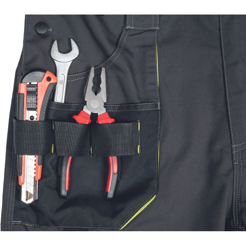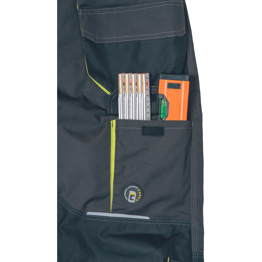 Pánské pracovní HI-VIS kalhoty s pružným pasem a multifunkčními kapsami; Oxford 600D zesílení kolenních kapes pro vkládání ochranných nákoleníků; odolné trojité prošití nohavic a sedu; 2 tištěné reflexní segmentované 7 cm pruhy na spodní části nohavic; nastavitelná délka nohavic.