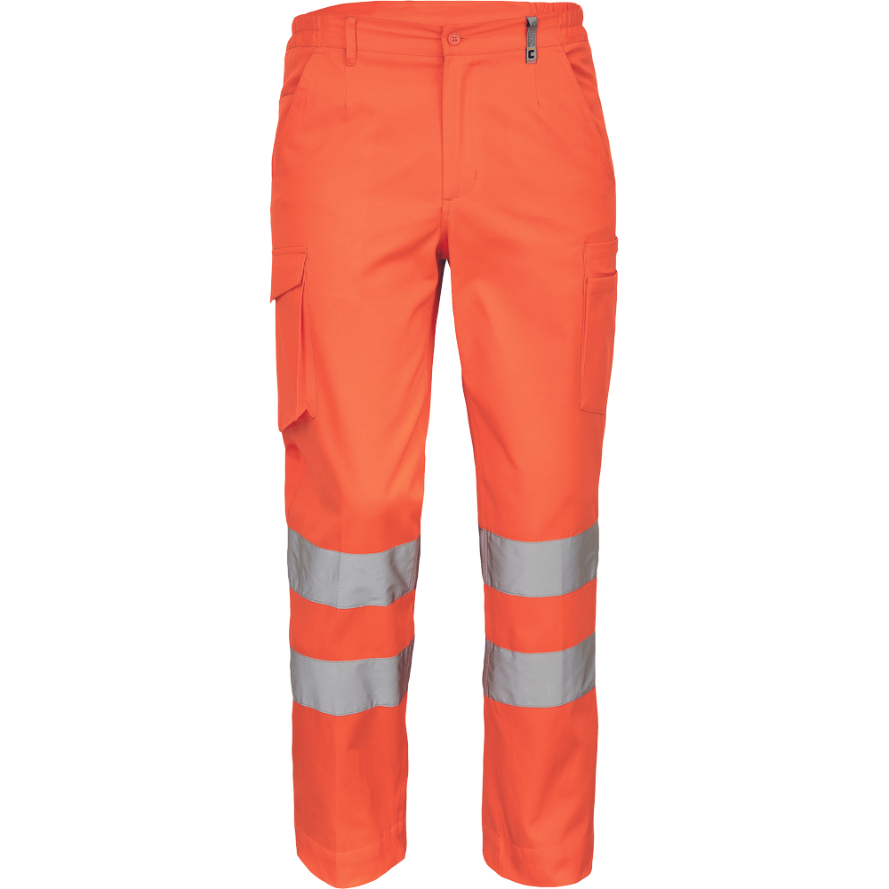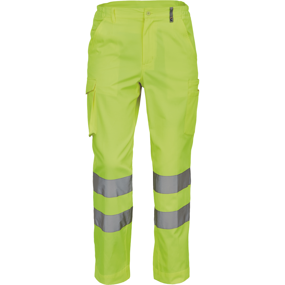 Pánské lehké full HI-VIS pracovní kalhoty a reflexními pruhy na nohavicích, elastický pas; 2 boční kapsy.Najděte svoji velikost