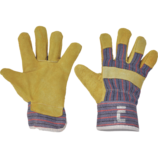 Rukavice z hovězí štípenky v dlani s podšívkou, hřbet a manžeta z bavlněné tkaniny.