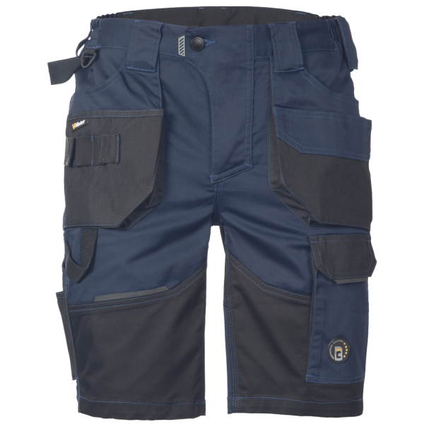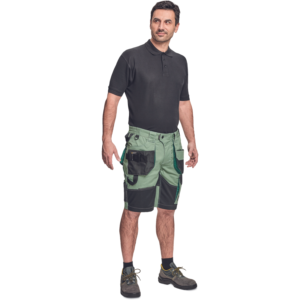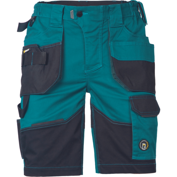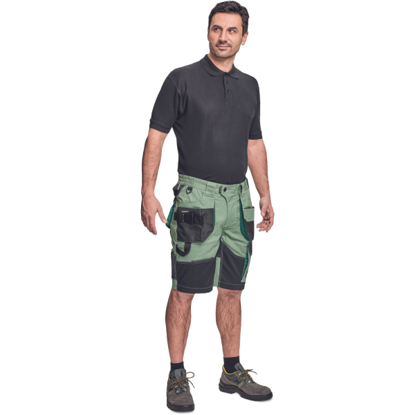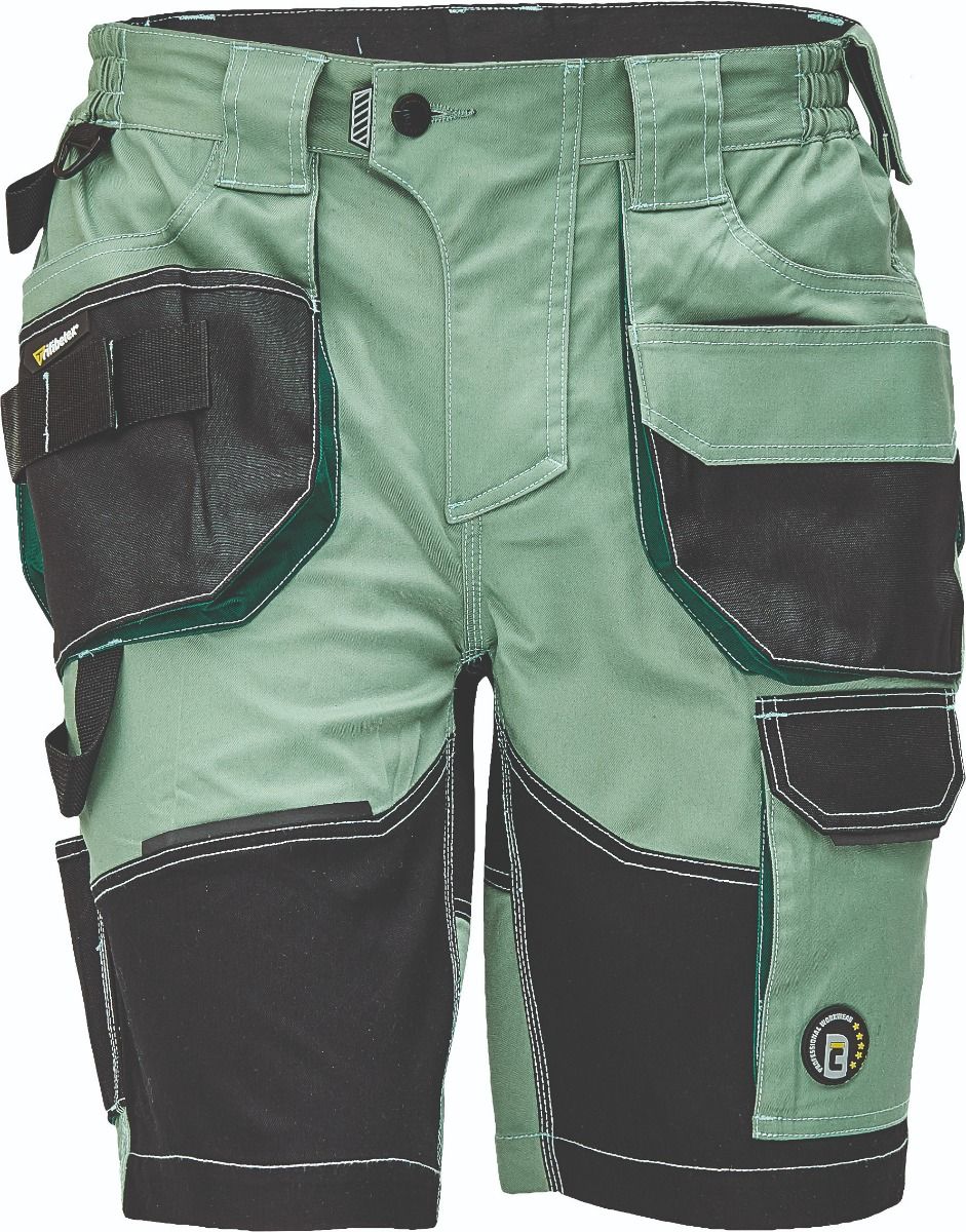 Pracovní šortky, elastický inovativní materiál TRIFIBETEX, ergonomický střih, snížený pružný pas, odolné trojité prošití nohavic a sedu, zesílená kapsa na nákoleníky.