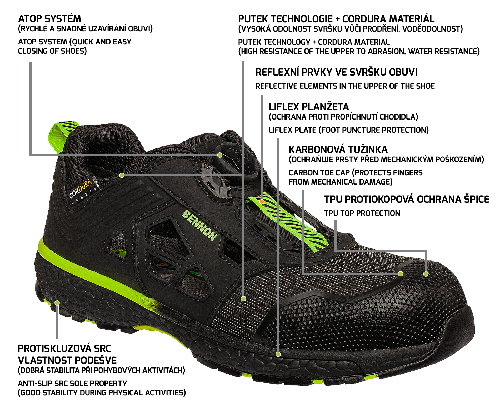Vyznačuje se vysokou odolností vůči mechanickému poškození, vůči vodě, kontaktnímu teplu, uzavírání obuvi je snadné a rychlé, obuv má spoustu bezpečnostních prvků, anatomicky tvarovaná stélka má zdravotní přínosy na stav chodidla, obuv je celkově mimořádně prodyšná.